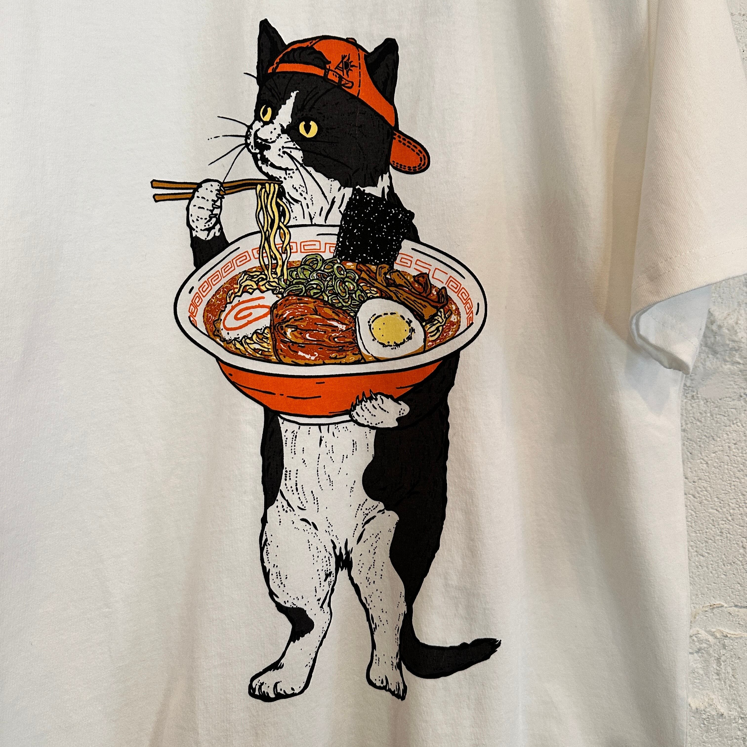 安心感のある素朴な味わい元祖中華そばをもつ猫のベーシックT。ボディーカラー毎にハチワレと黒猫をプリント。ラーメンTシャツ待望の春夏アイテムで登場。☆