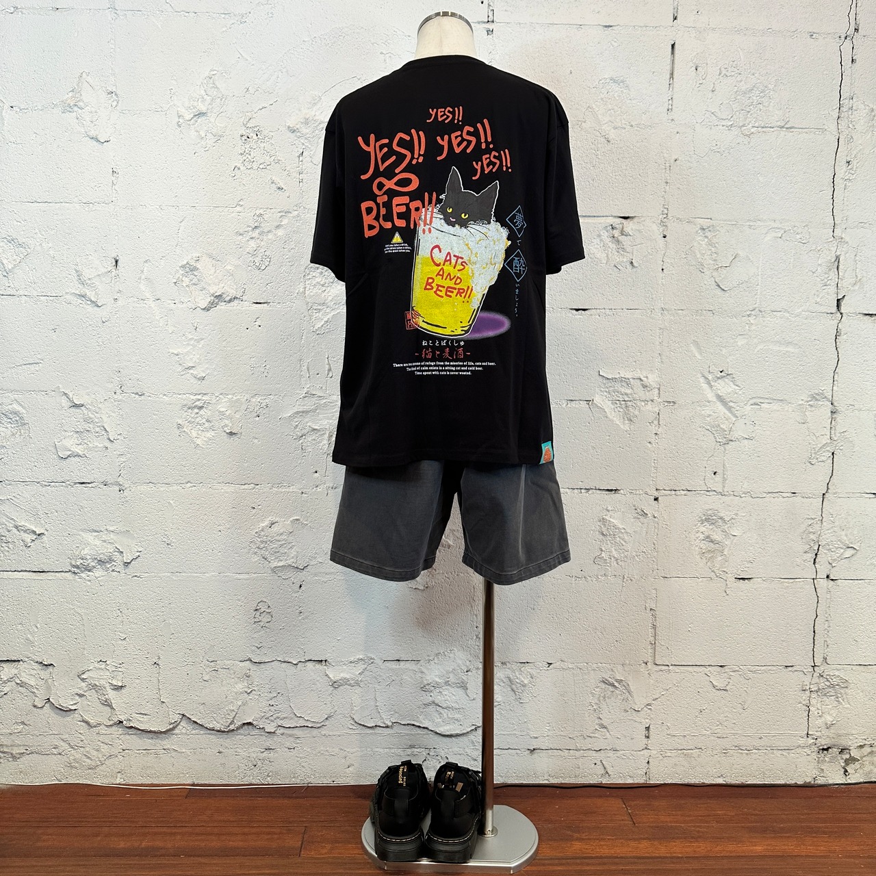 生地馴染みの良いプリント手法でカラフルにバックプリント。麦酒グラスにキジトラと黒猫にケミカルカラーの猫。フロントにはワンポイントプリント。猫と麦酒好きには是非ともゲットしていただきたい1枚。さらっとドライタッチで麦酒が美味しい季節におすすめのベーシックシルエットTEEです。