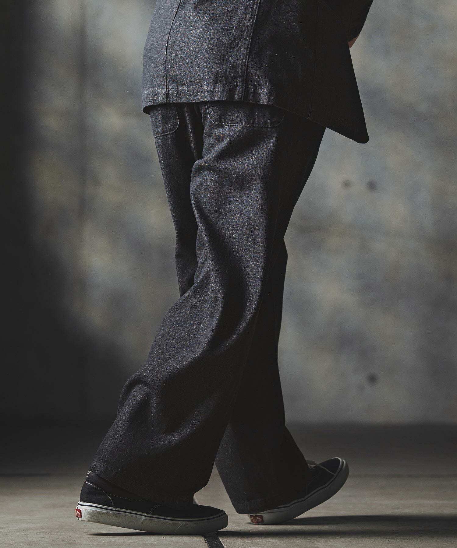 ボリュームのあるワタリやヒップ周りから真っすぐ落としたようなワイドストレートシルエット。