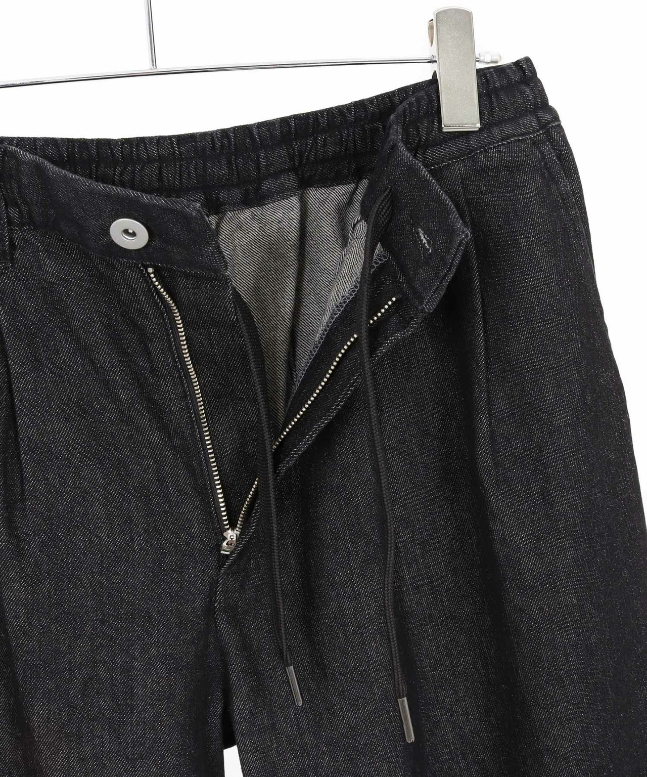 ボタン&ファスナーのフロント開閉に加え、ウエスト周りに平ゴム&スピンドルを配したイージー仕様。
