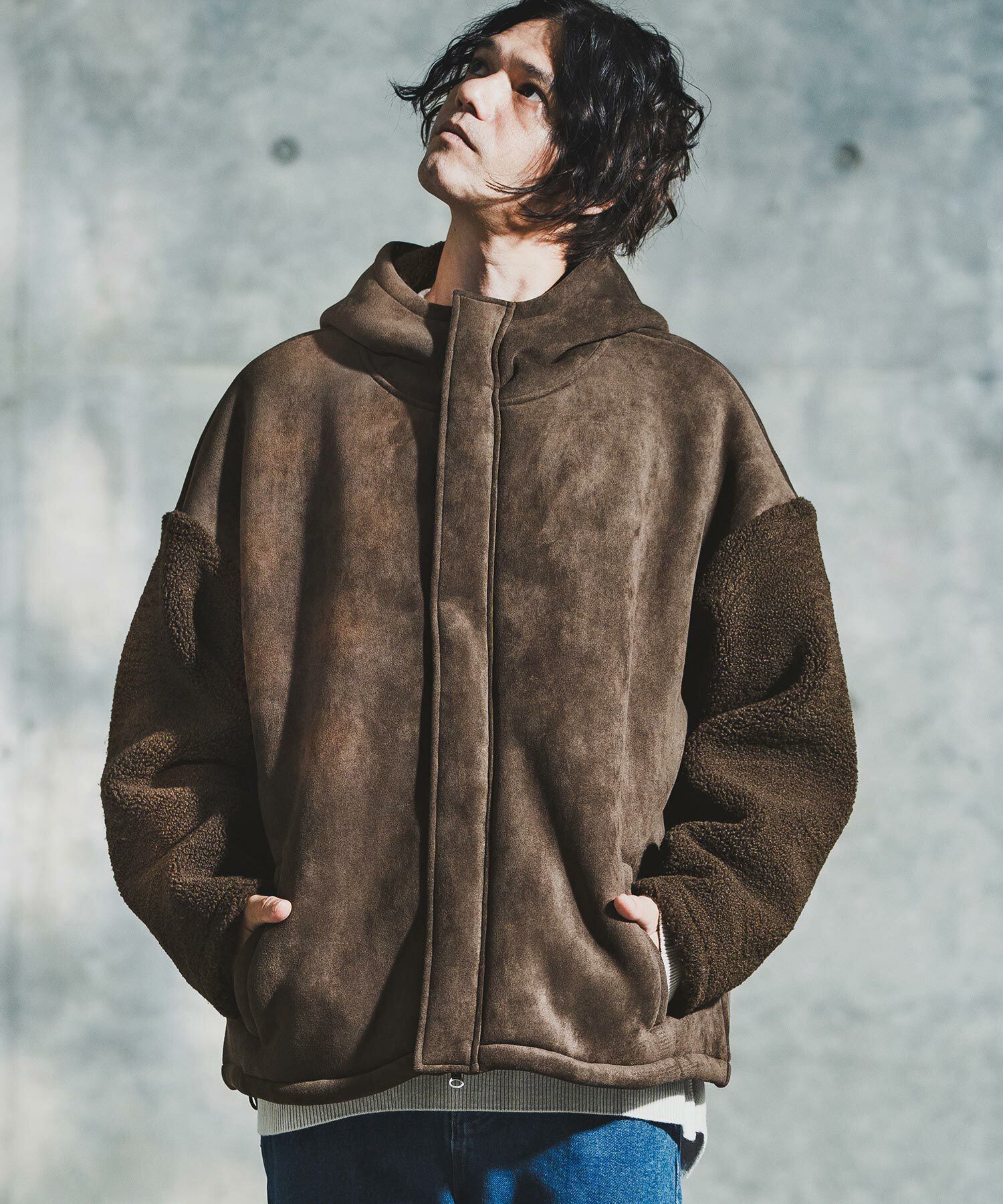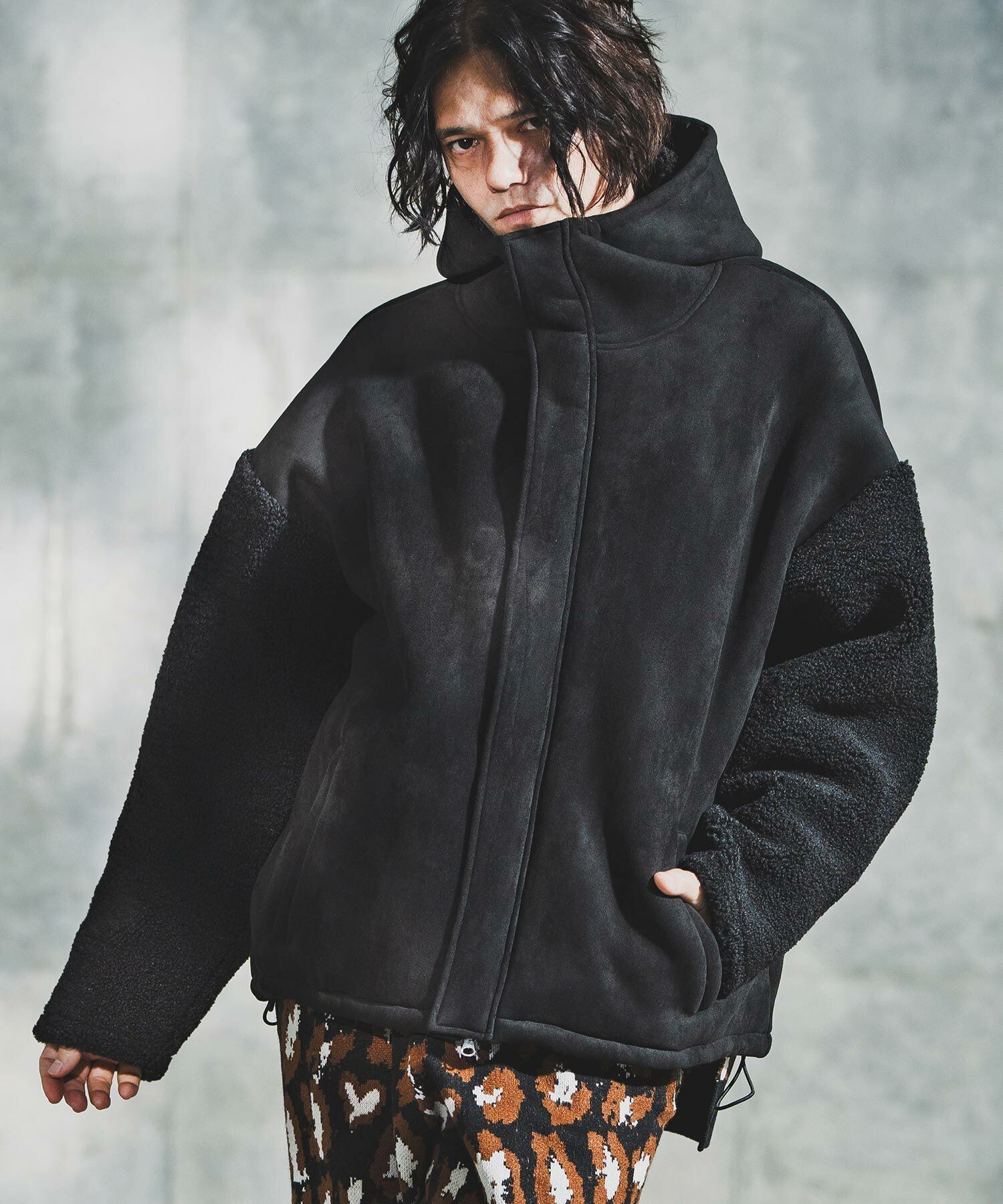 フェイクムートンとシープボアを切り替えた、フーデッド仕様のショートジャケット。