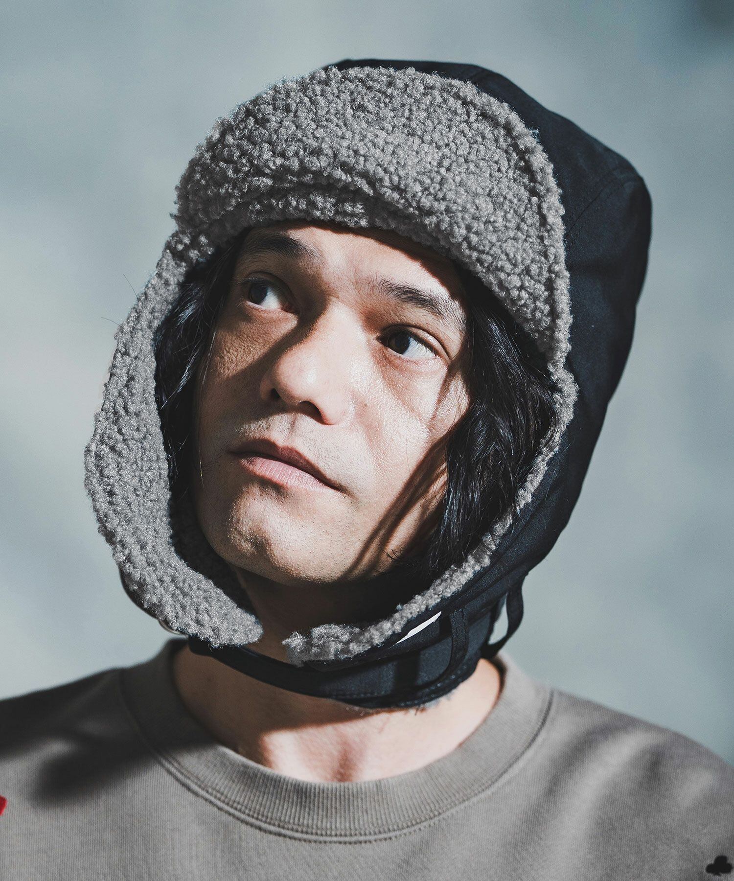 イヤーフラップは、垂らしてそのまま被るスタイルと、上部で留めてすっきりとした印象に整える2WAY仕様。