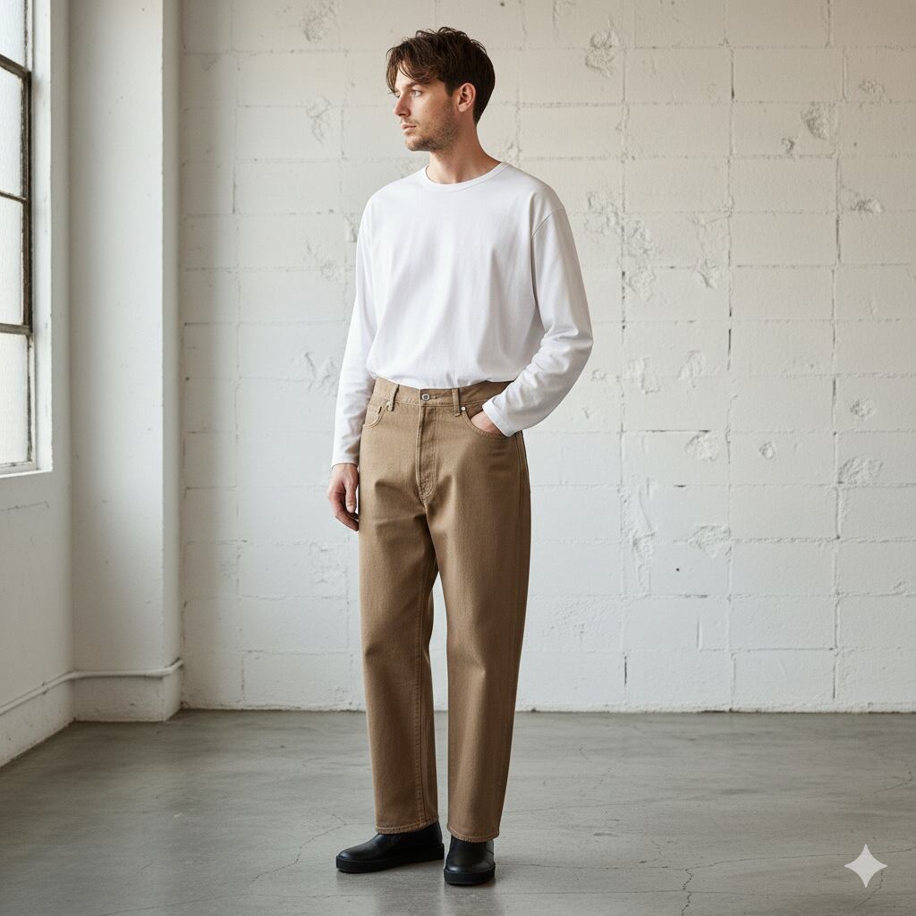 • 絶妙な太さ: 以前紹介したCOMOLIの5Pパンツほどの爆発的なボリュームではなく、よりクリーンで垂直に落ちるようなストレートラインが特徴です。