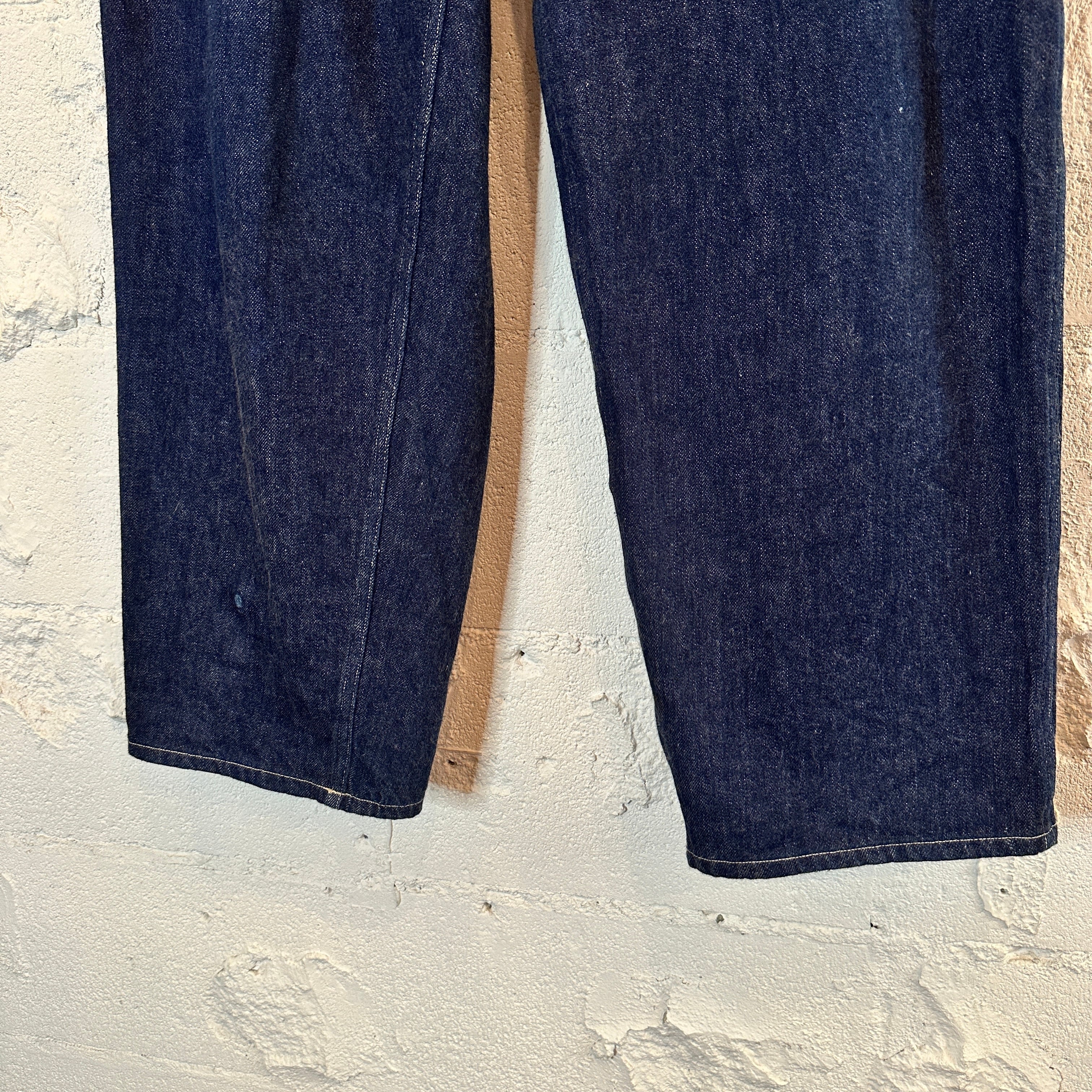• 縮みと斜行: 生機の風合いを活かしたデニム素材のため、洗濯を繰り返すことで若干の縮みや、生地がねじれる「斜行」が発生しますが、これは意図されたヴィンテージ特有の仕様です。