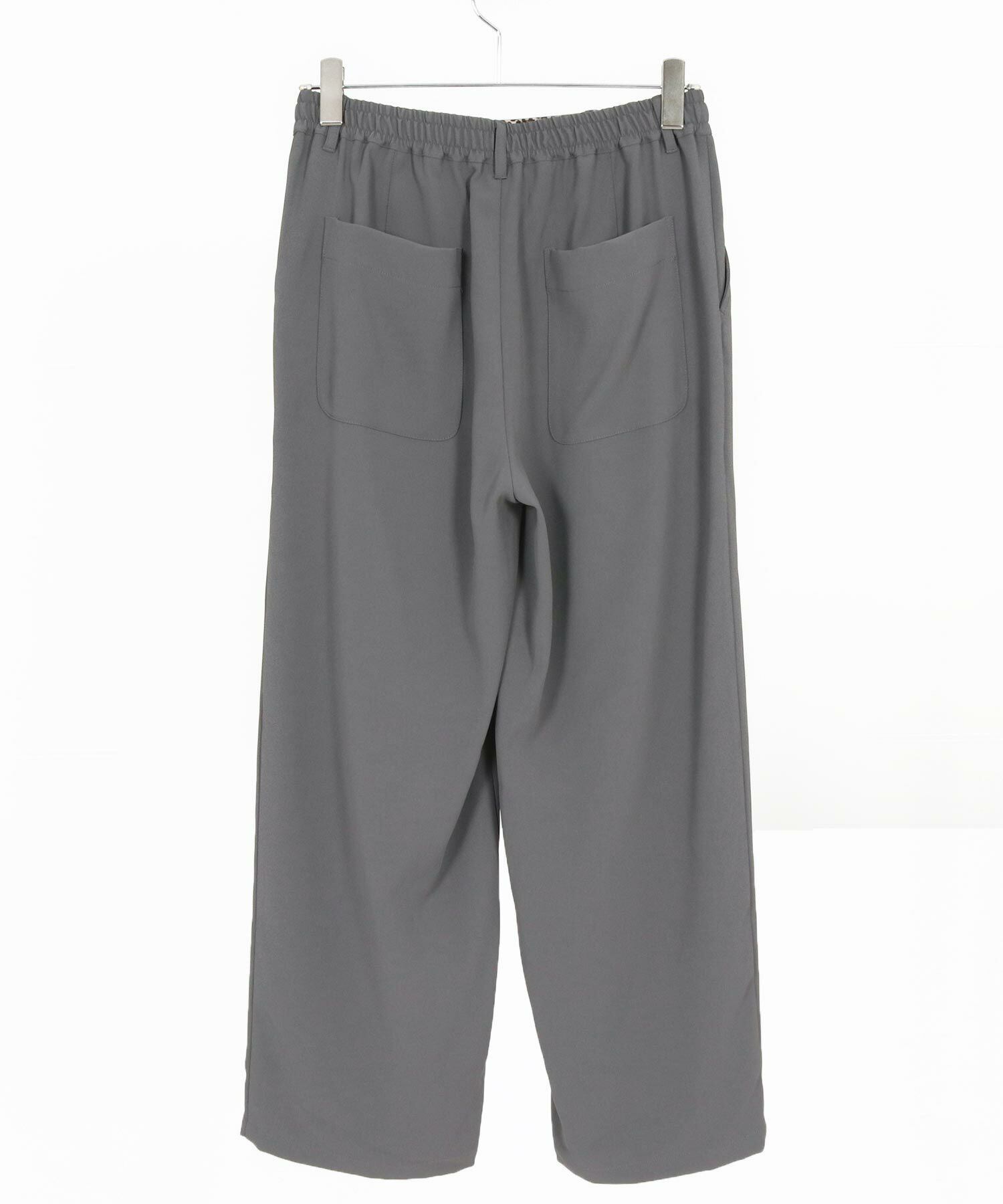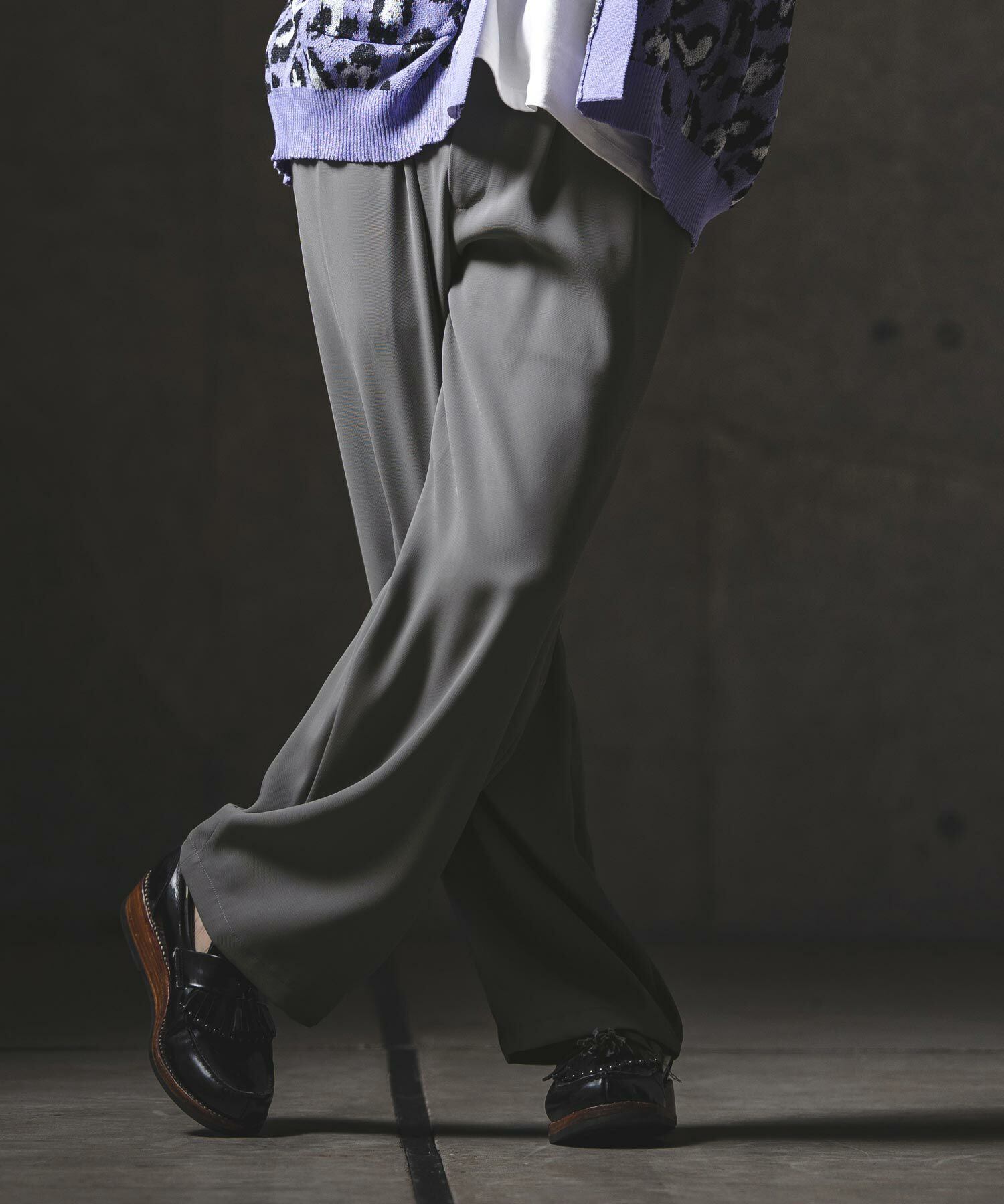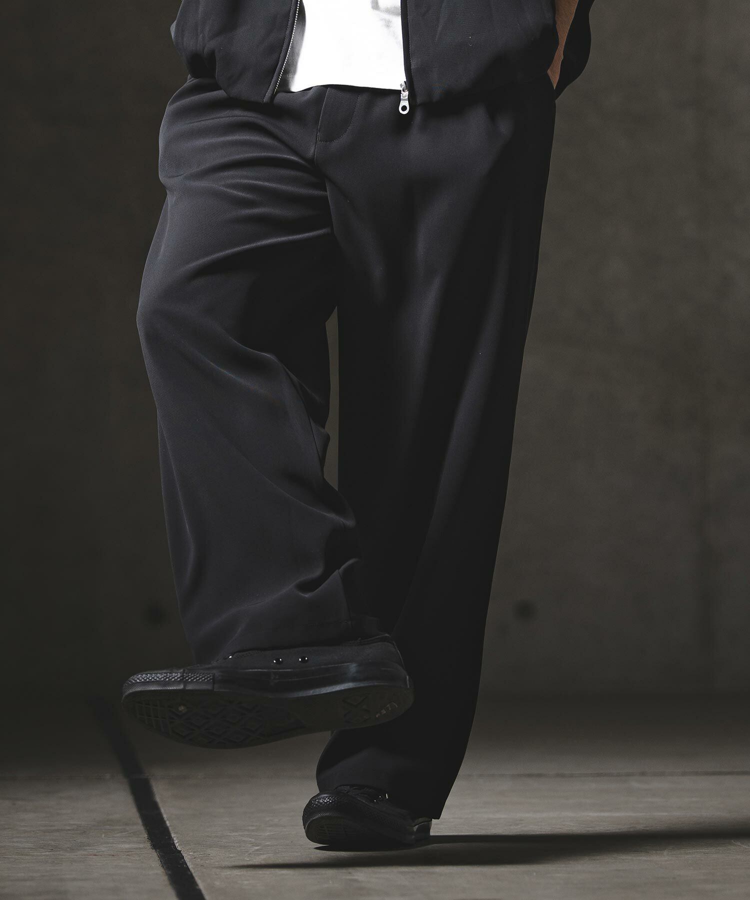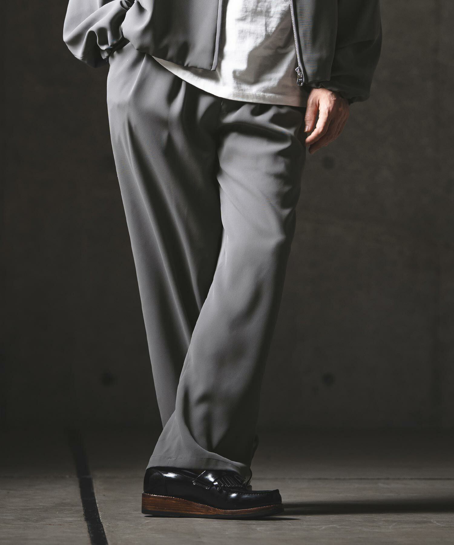 しなやかな風合いのポリエステルクロス素材を使用した、ワイドストレートパンツ。