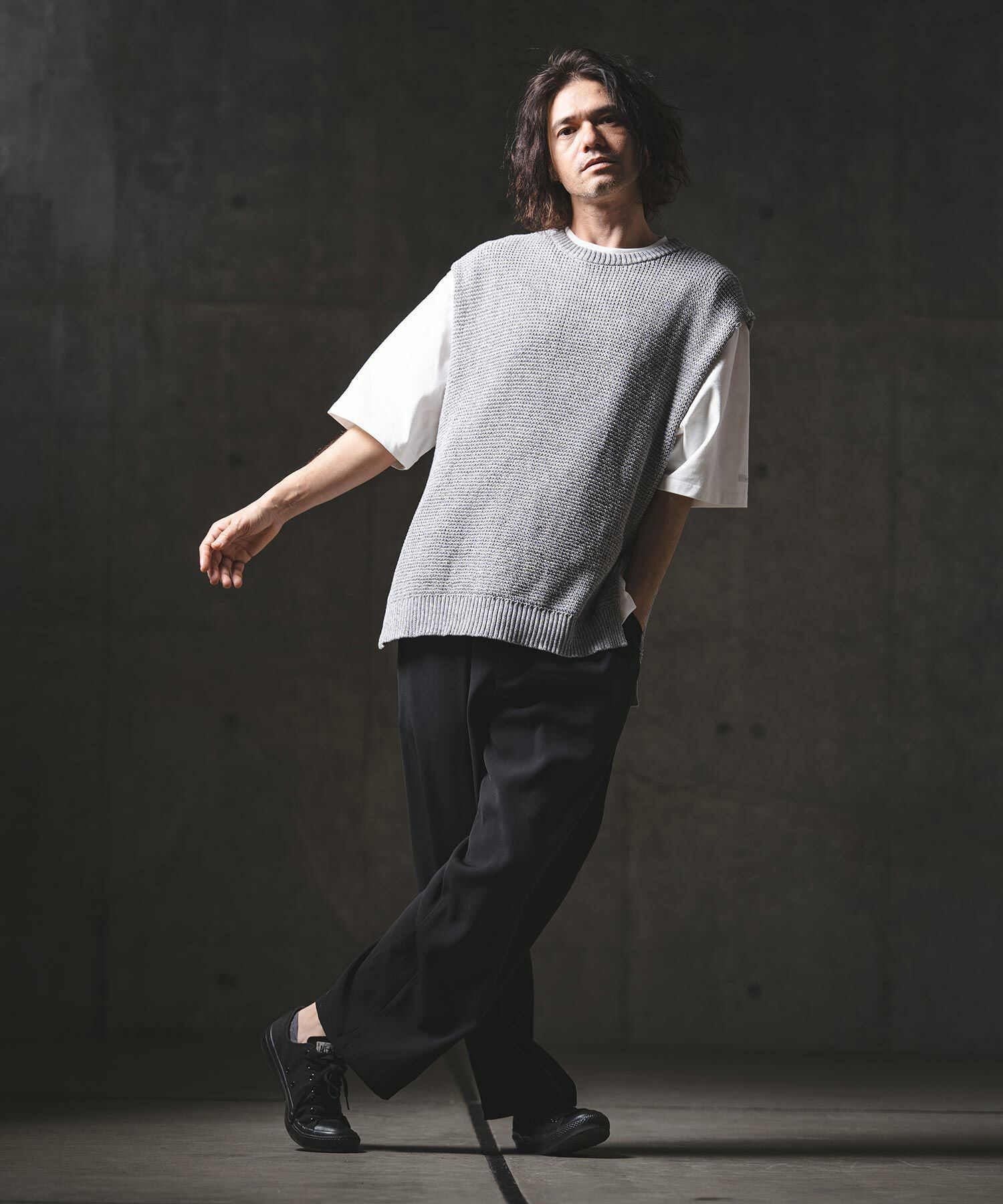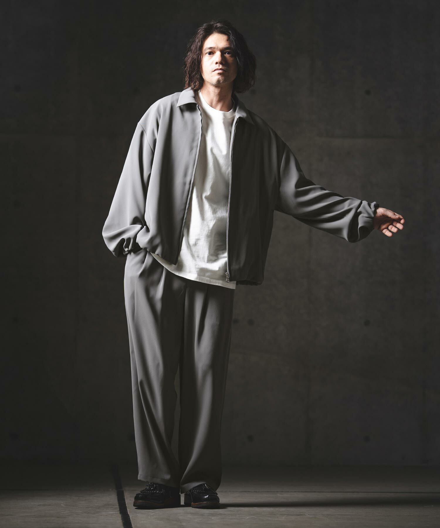 同素材の羽織りアイテムとのセットアップにも対応し、洗練された統一感のあるスタイリングが可能な一枚です。
