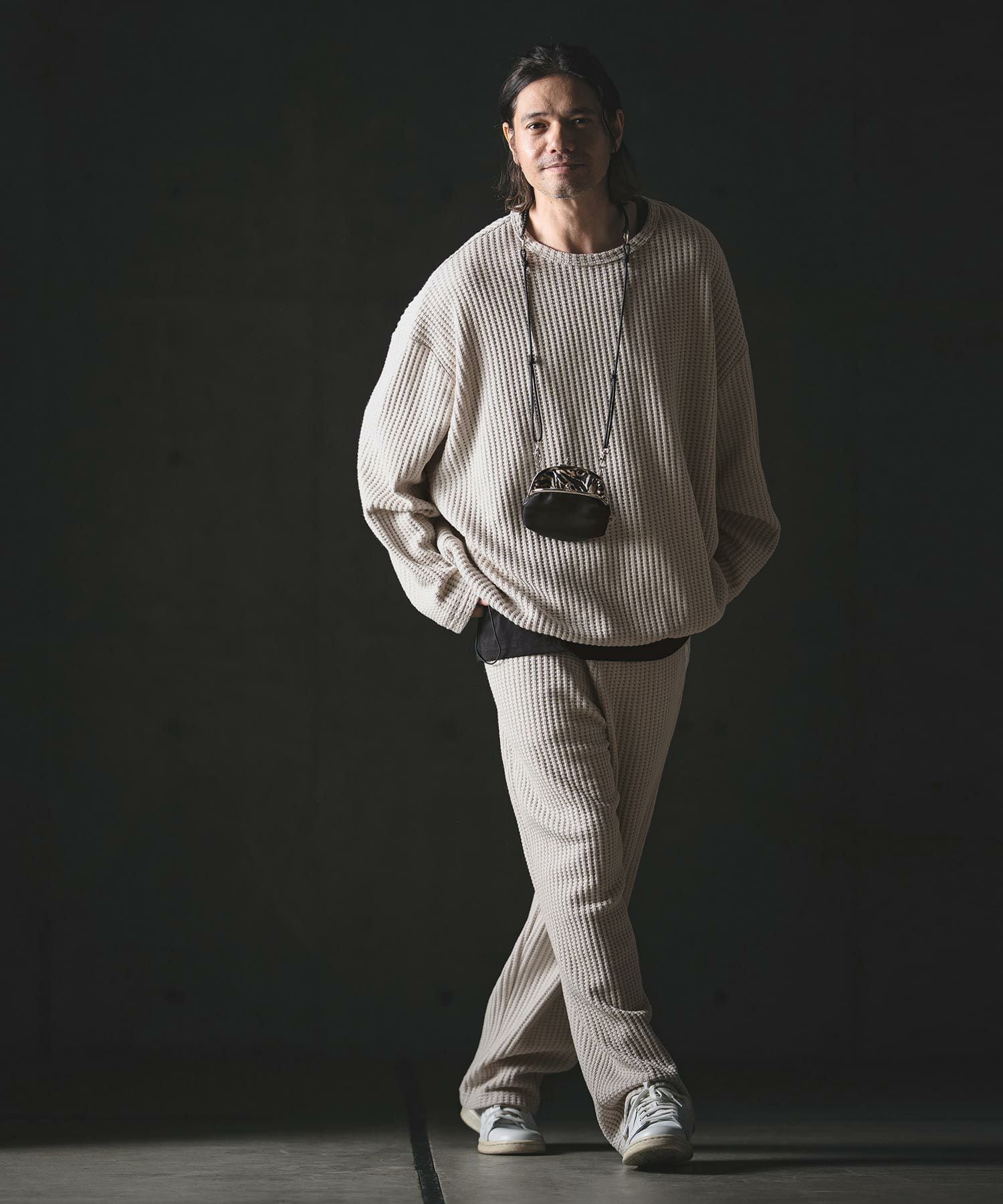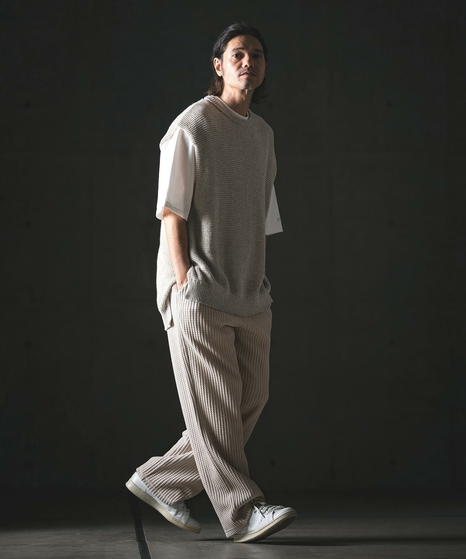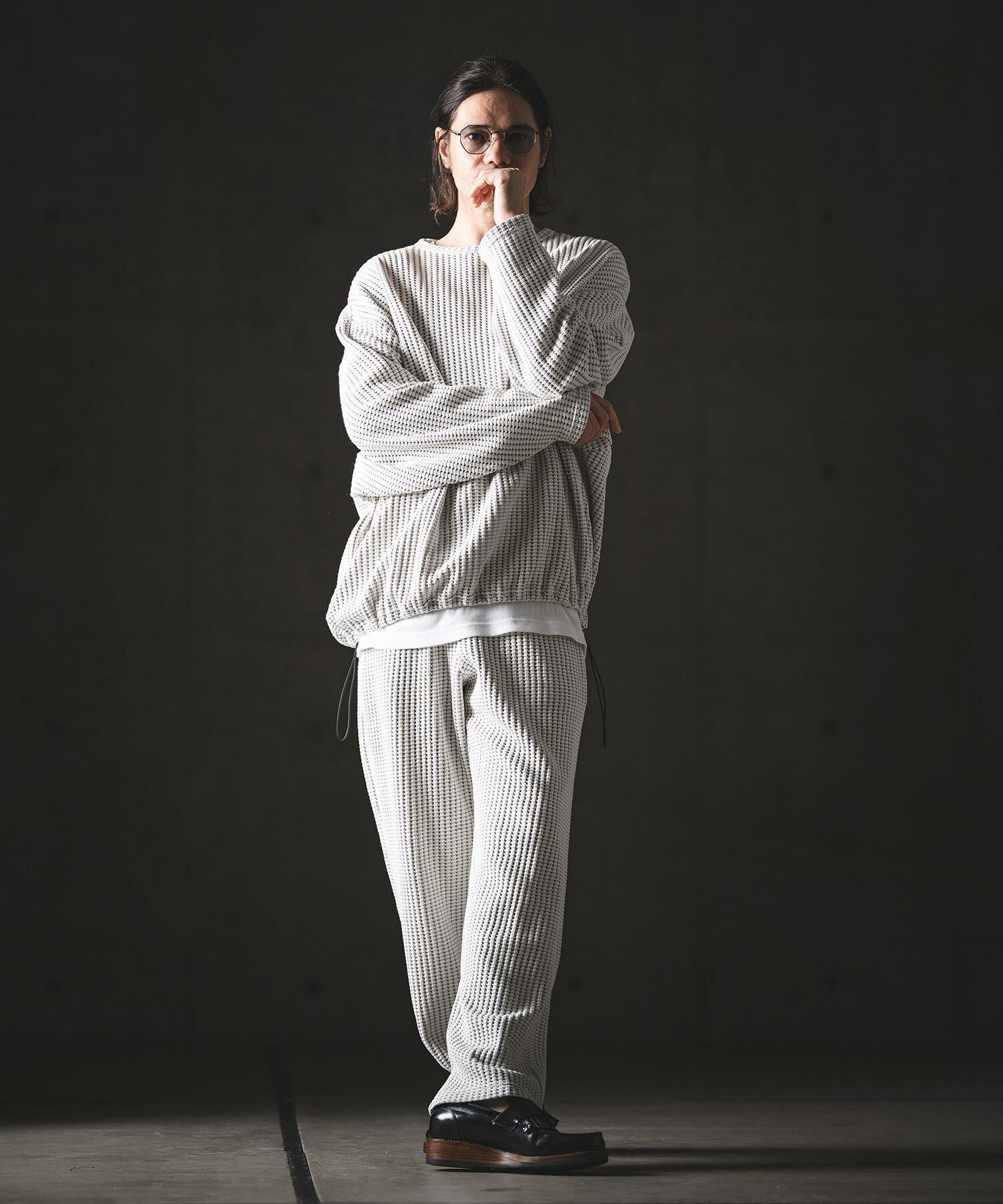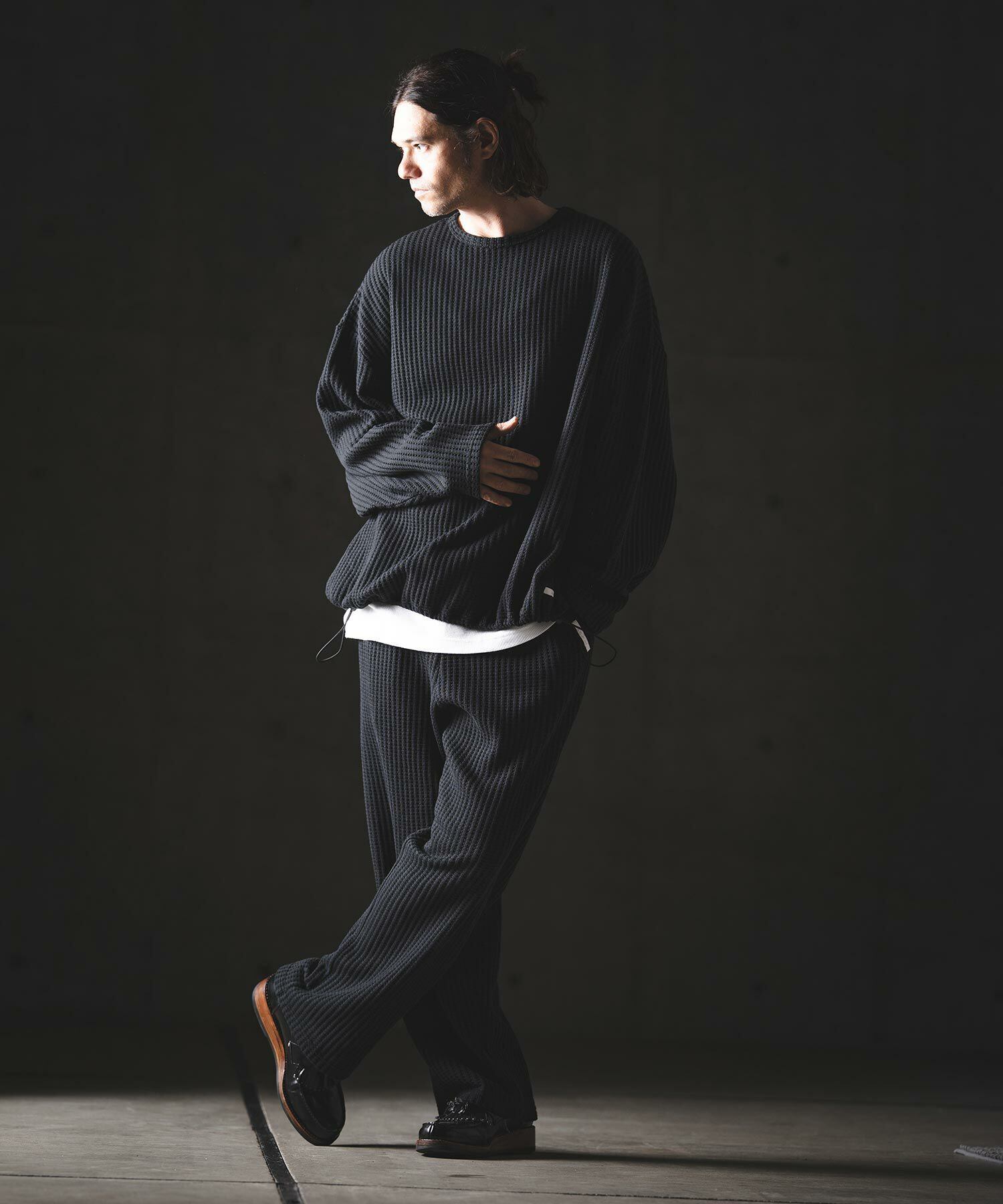凹凸のある編み地が特徴のビッグワッフルカットソーを使用。
