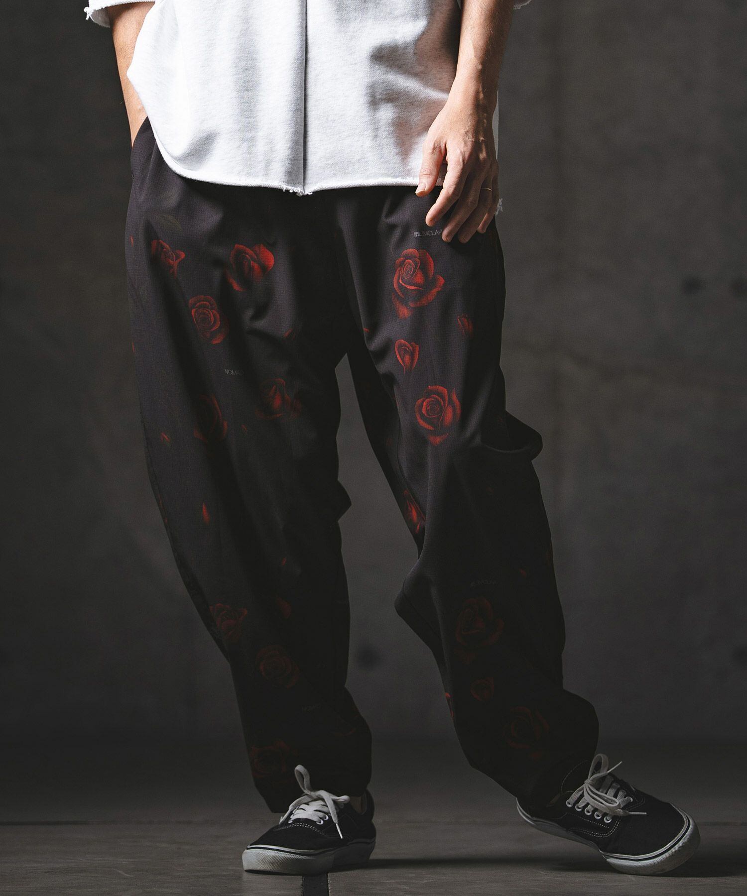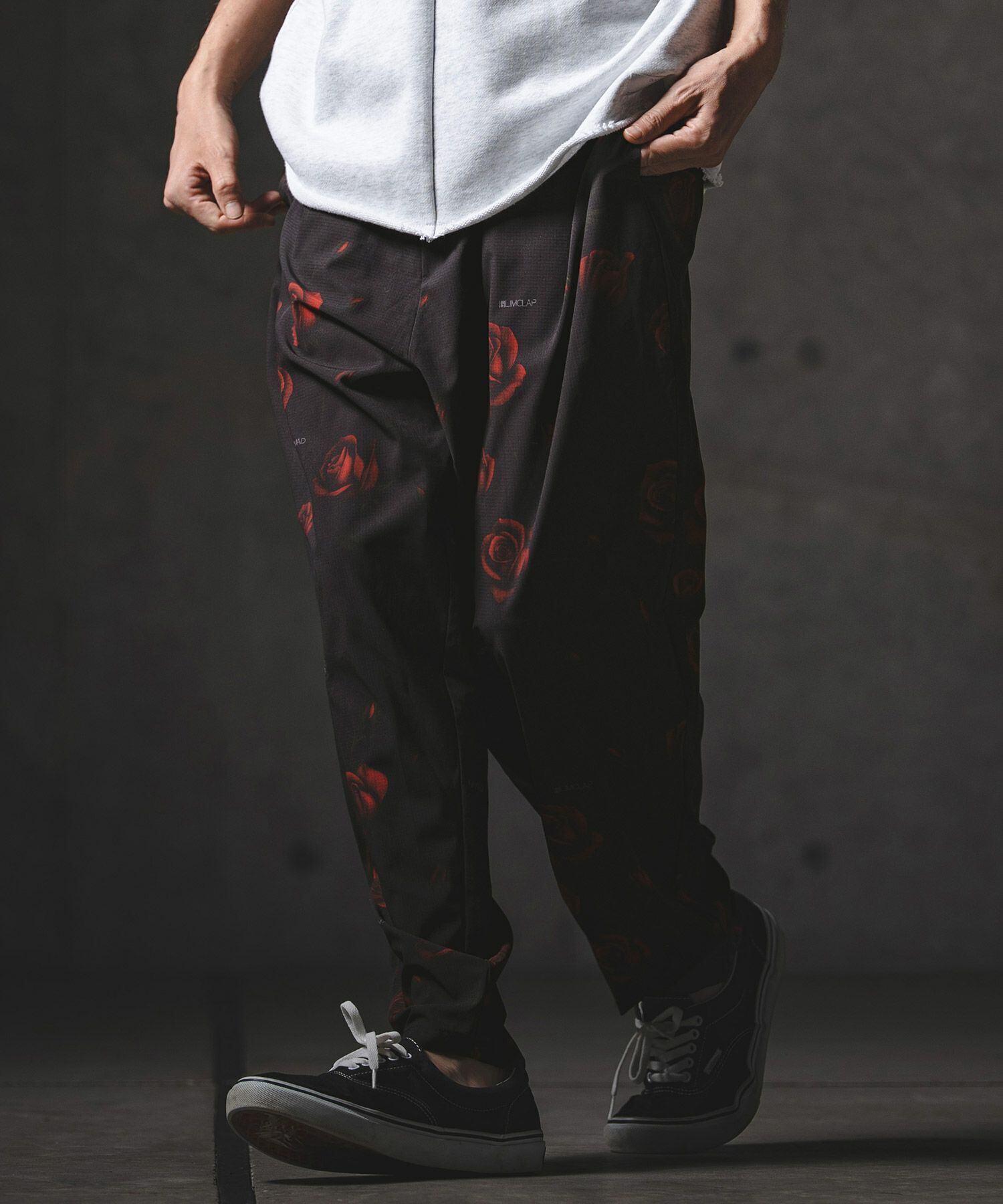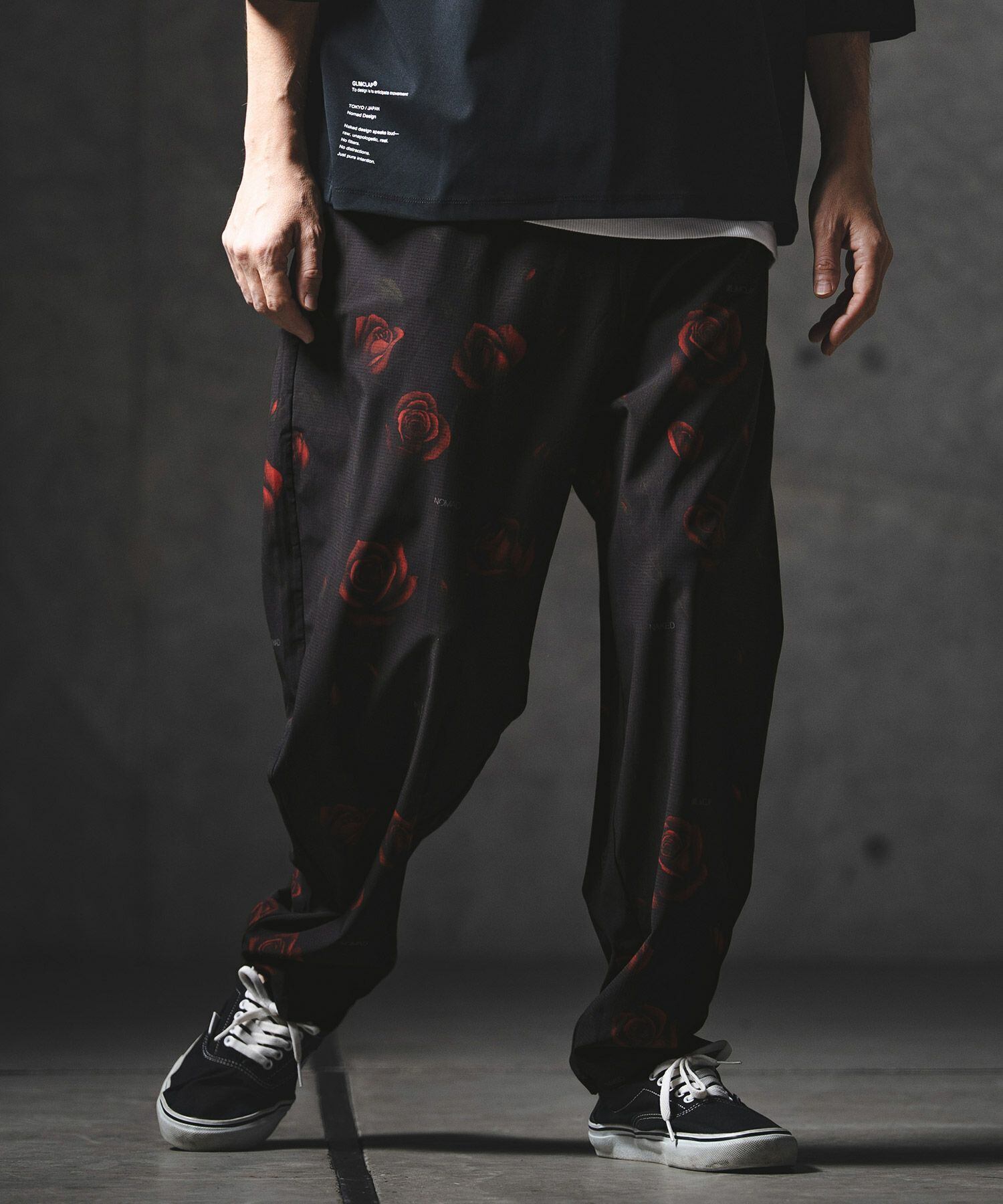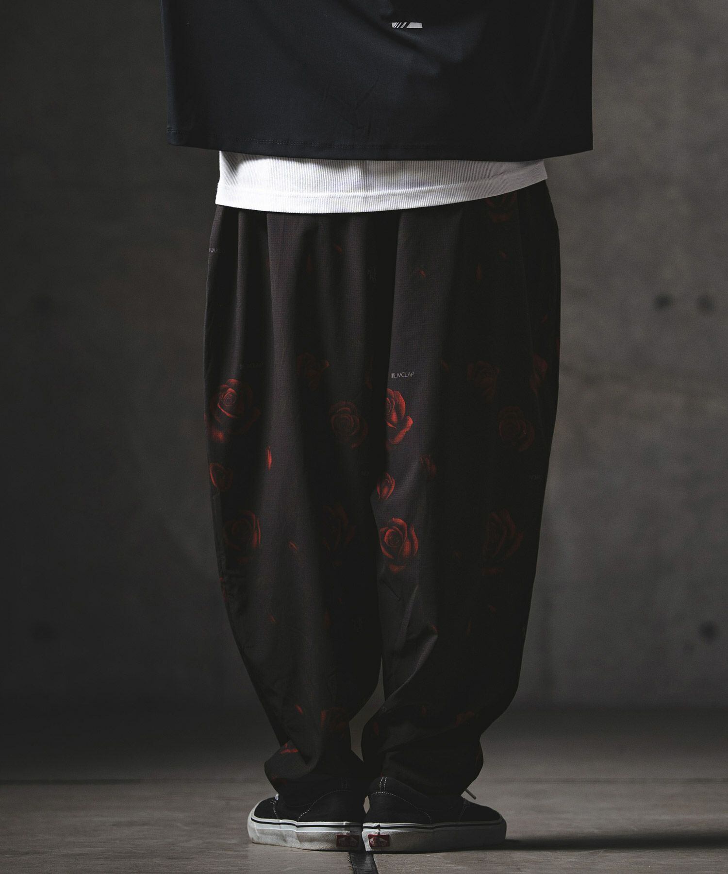 ブラックベースに薔薇柄をあしらった、オリジナルのボタニカルパターンが映える高機能ポリエステル素材のバルーンパンツ。