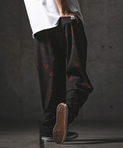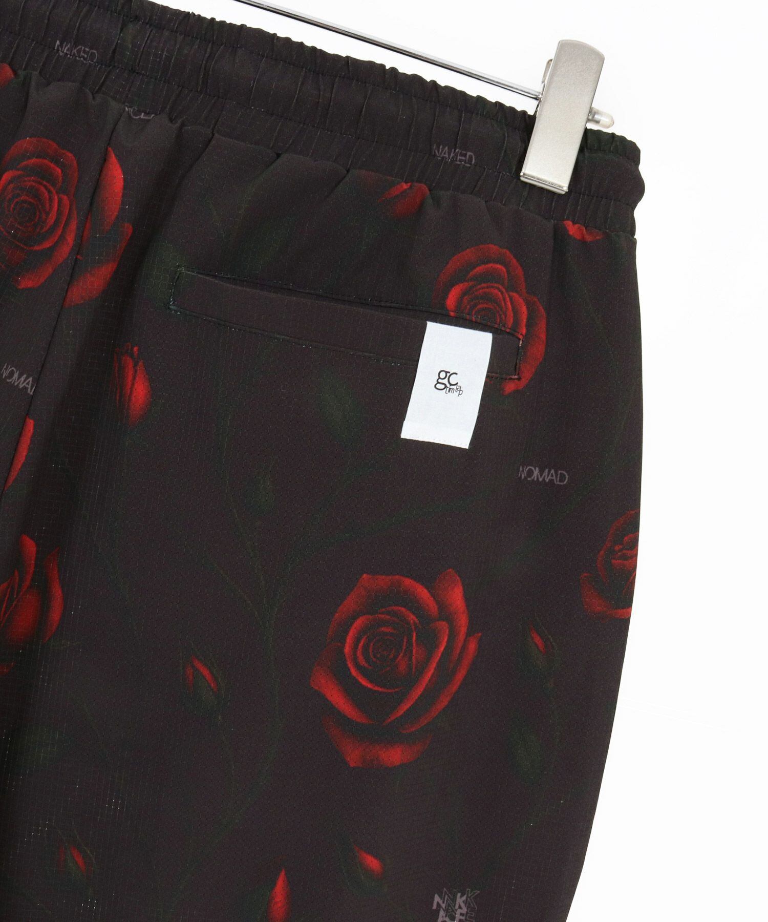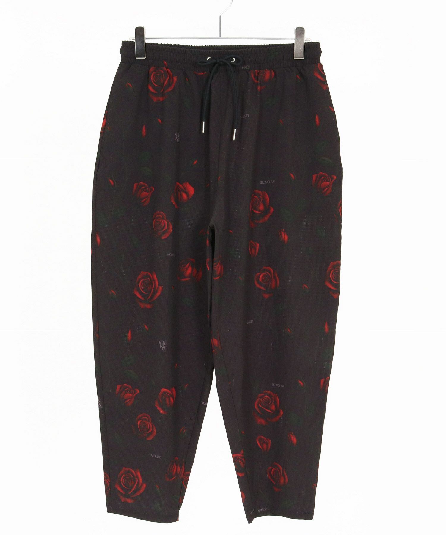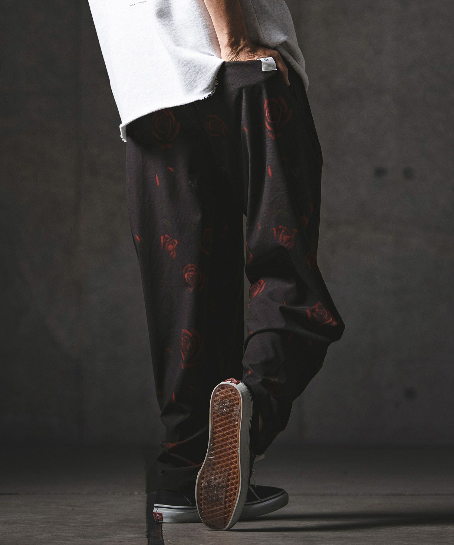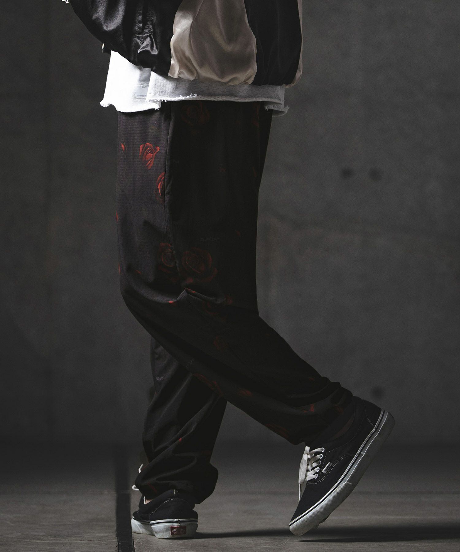 ブラックベースに薔薇柄をあしらった、オリジナルのボタニカルパターンが映える高機能ポリエステル素材のバルーンパンツ。