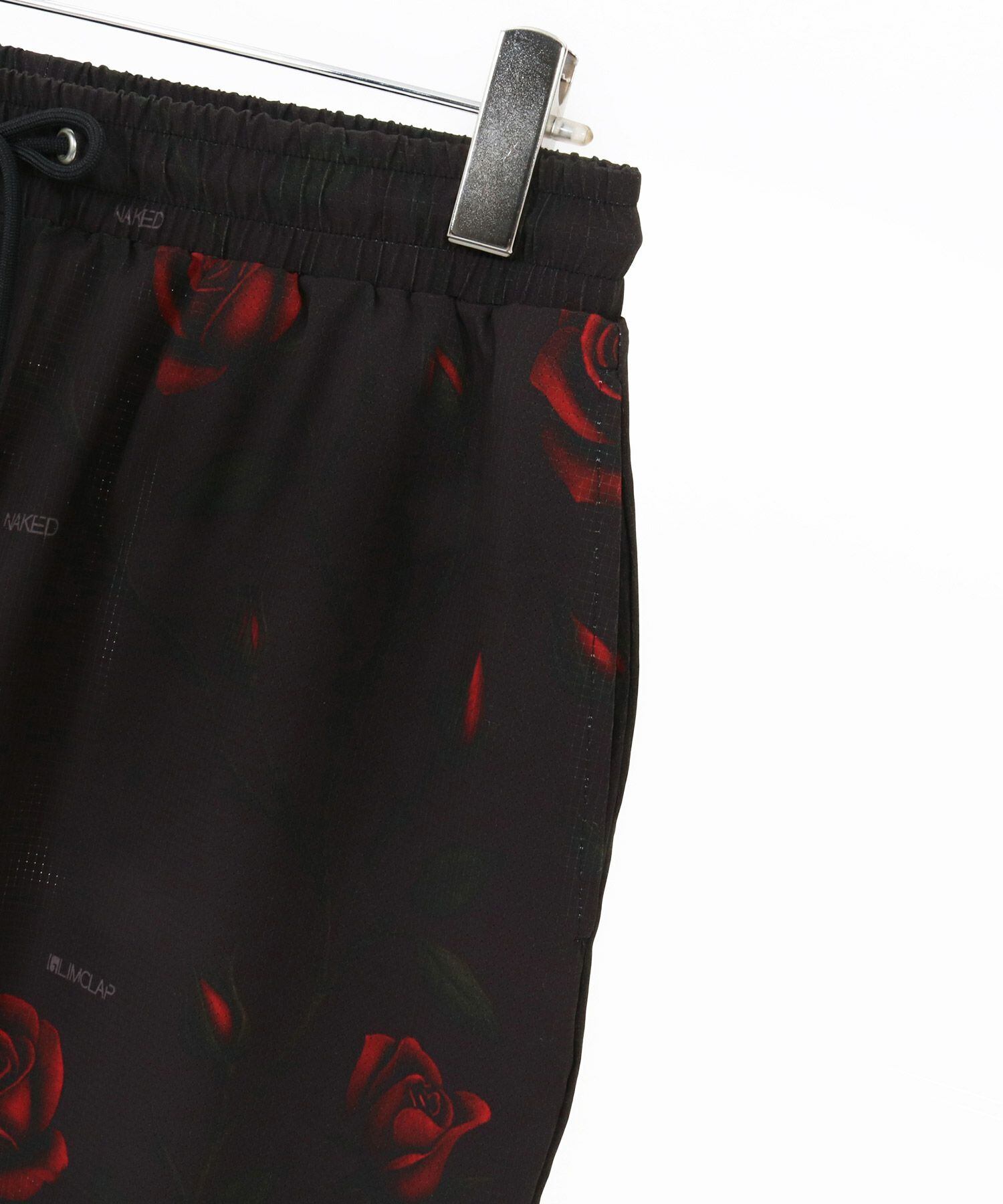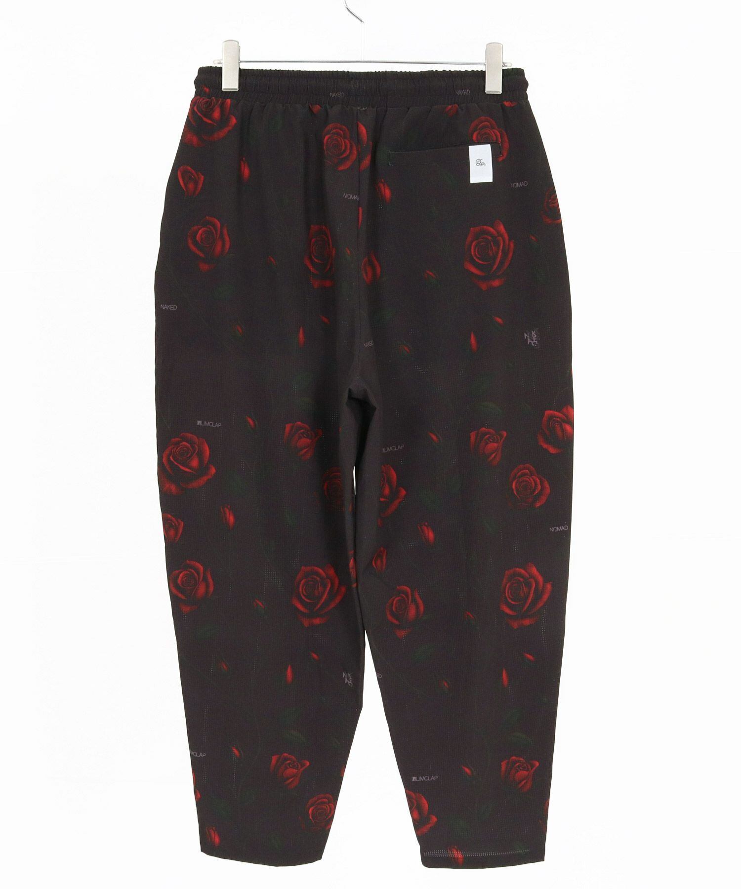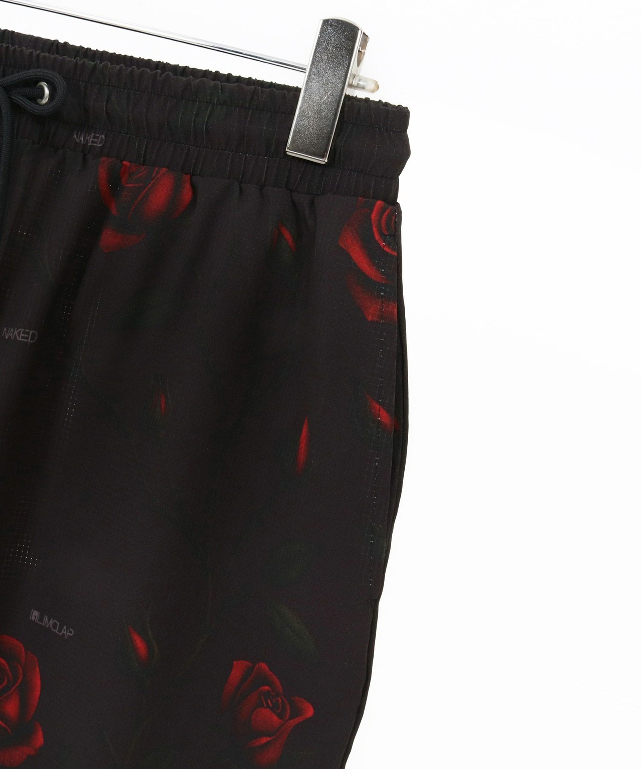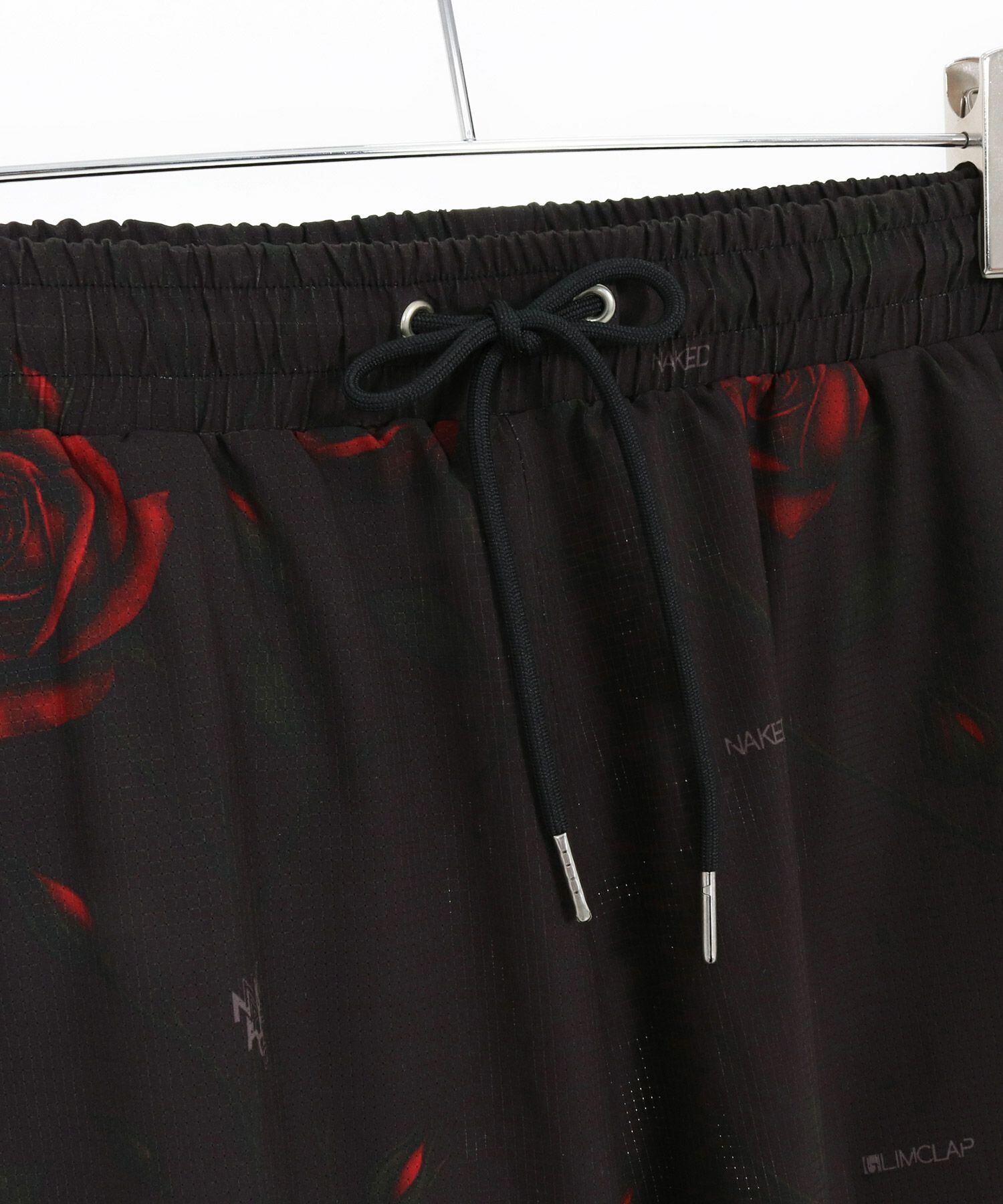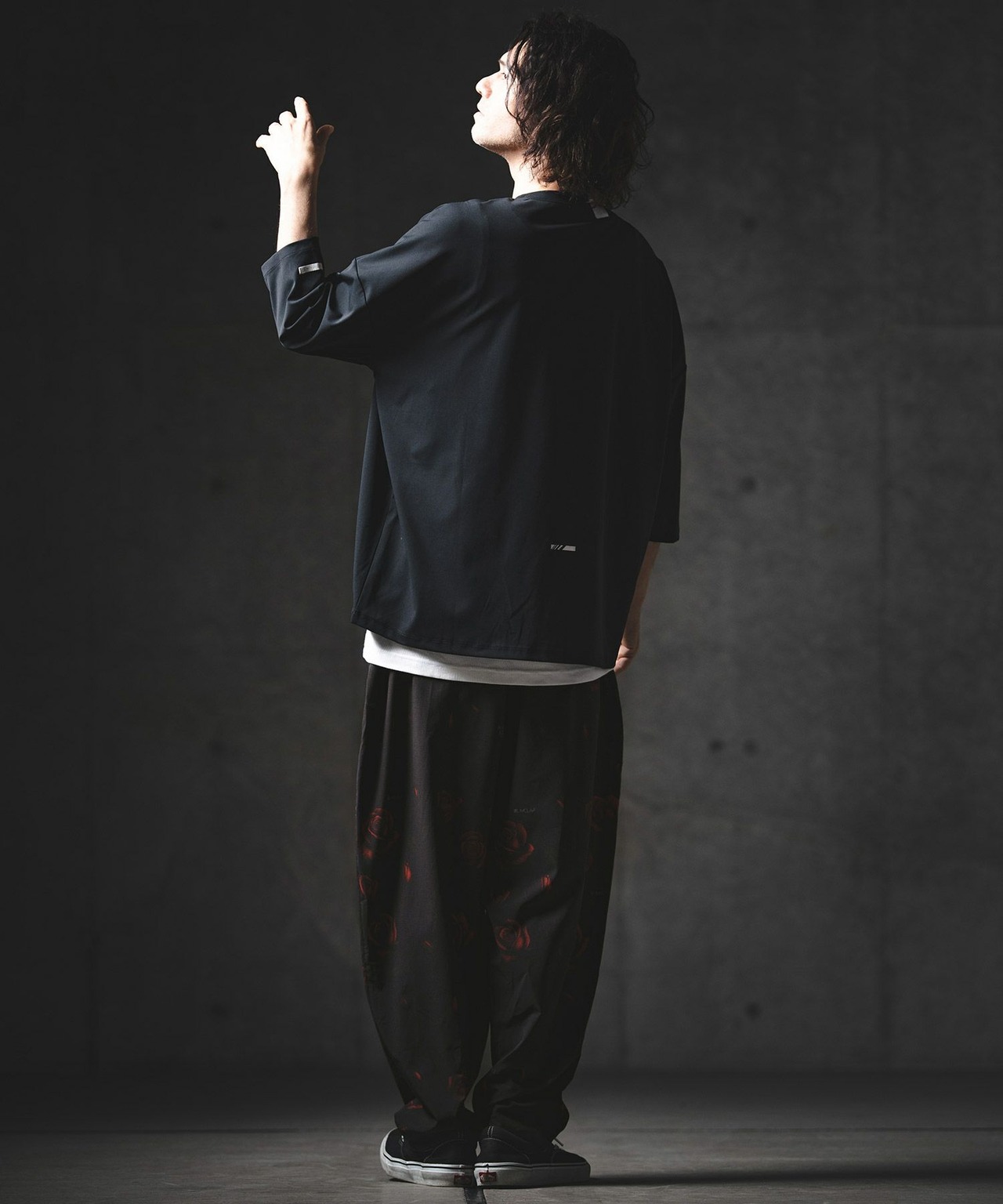 ブラックベースに薔薇柄をあしらった、オリジナルのボタニカルパターンが映える高機能ポリエステル素材のバルーンパンツ。