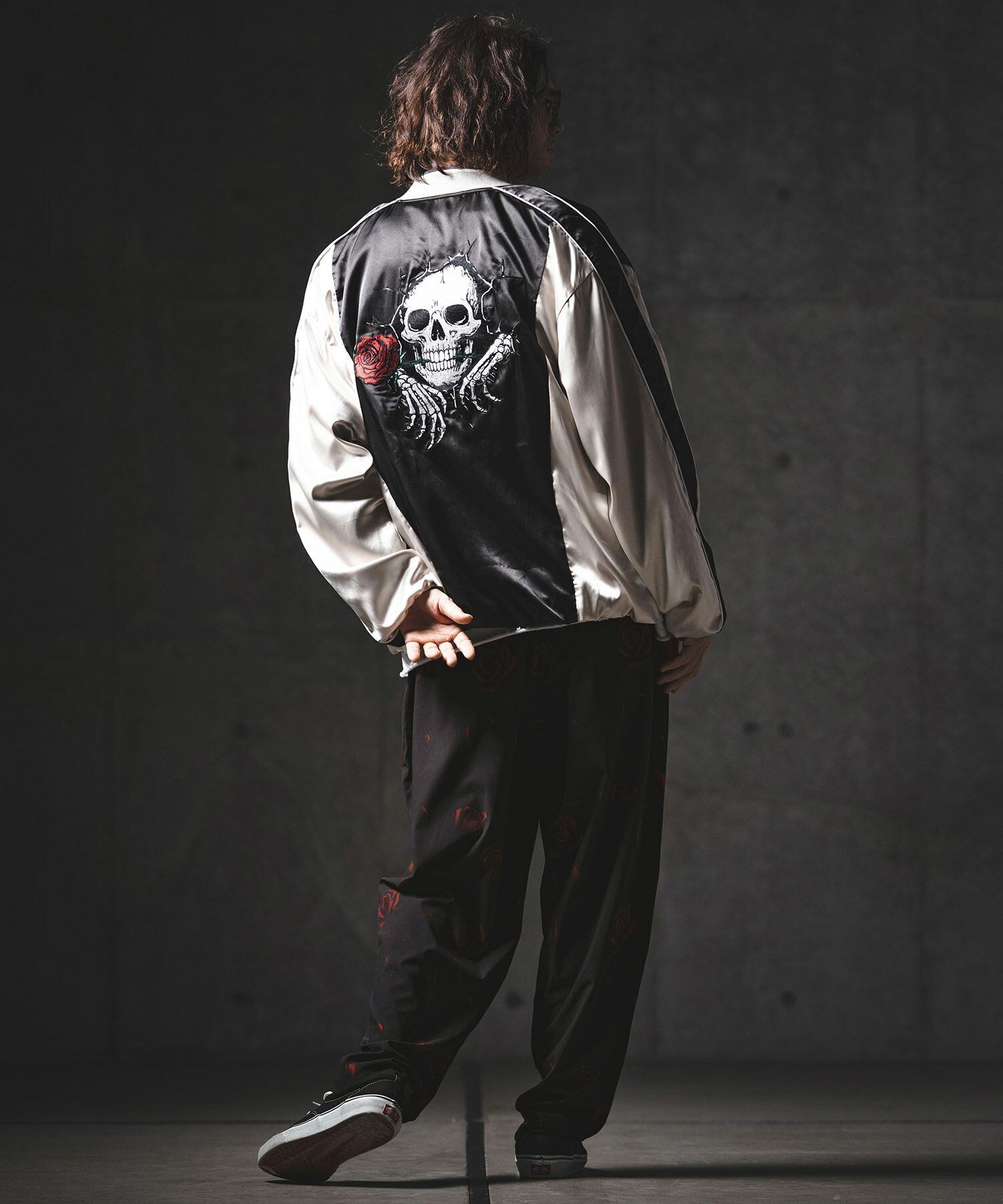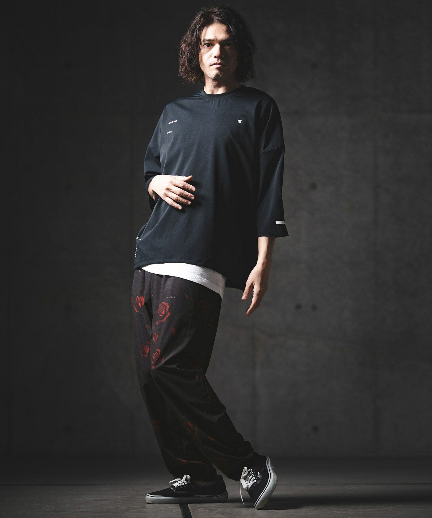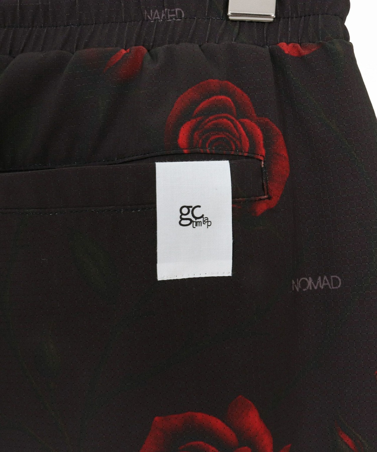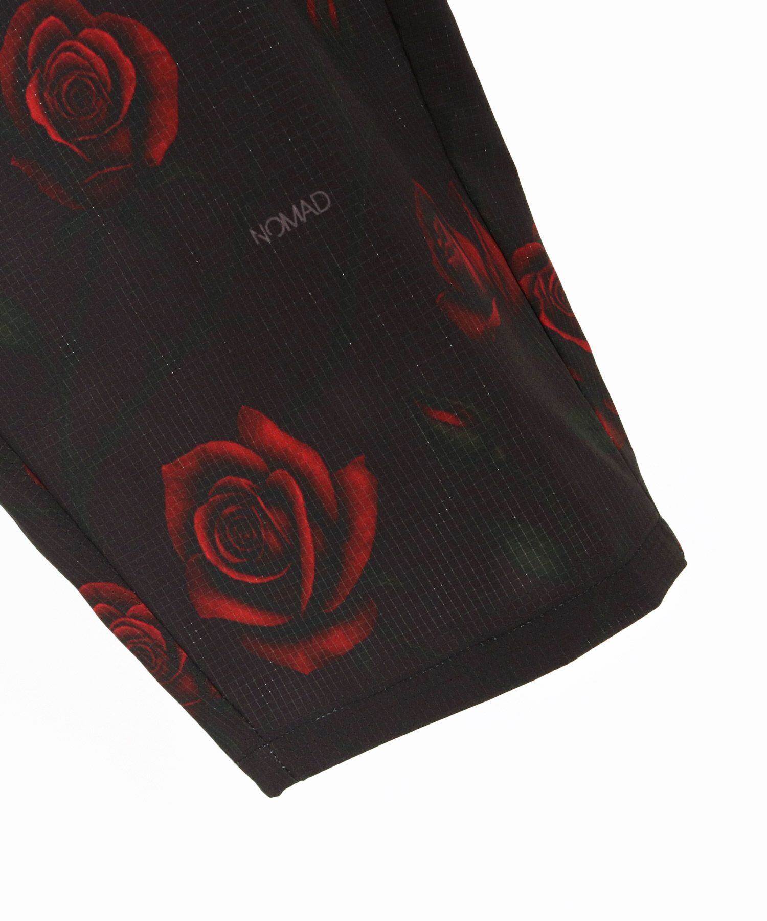 ブラックベースに薔薇柄をあしらった、オリジナルのボタニカルパターンが映える高機能ポリエステル素材のバルーンパンツ。