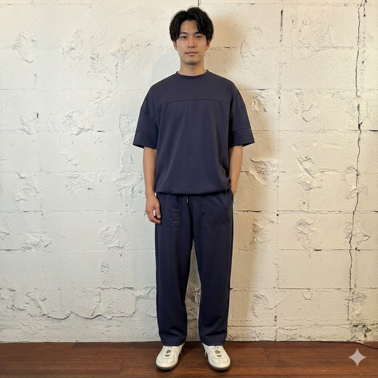 同素材のトップスアイテムも展開し、カジュアル&スポーツライクなセットアップコーデも可能です。