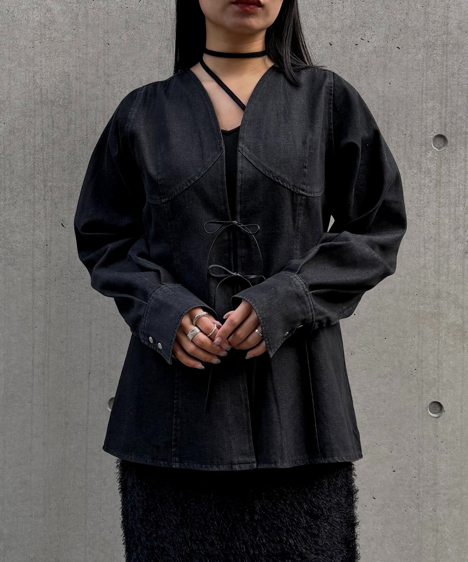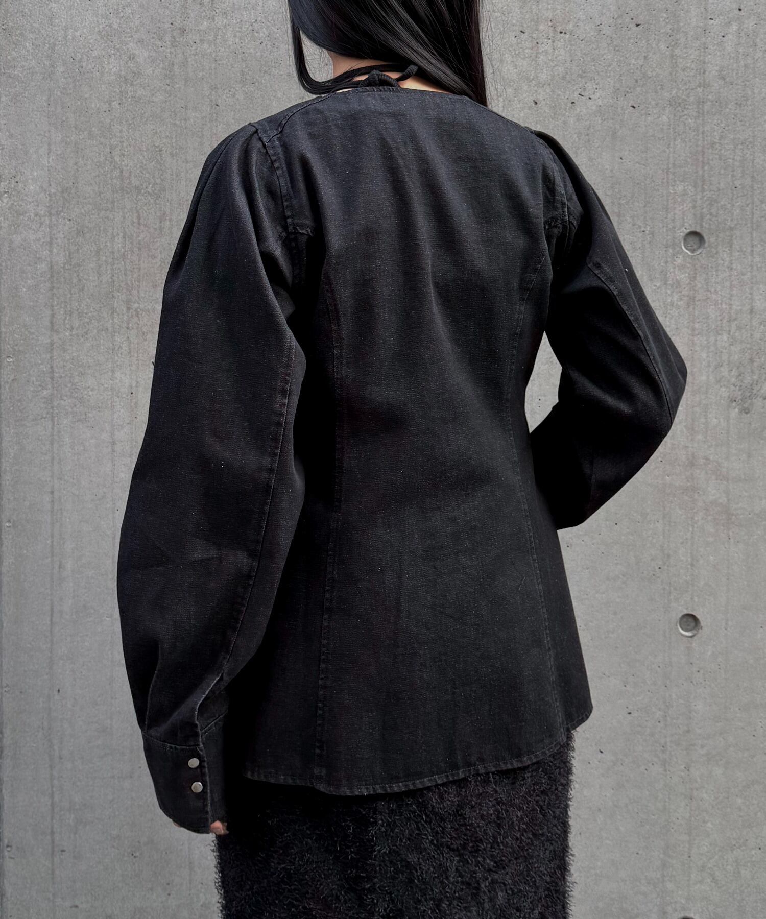 裾は広がりすぎないペプラムラインに仕上げ、大人らしい上品な印象に。切替部分のステッチはあえて同色系でまとめ、デニムのカジュアルさの中に洗練された雰囲気をプラスしました。すっきりとしたVネックに、ブラックレザーのリボンをあしらい、&g’aimeらしいレディーモード感を演出。程よい厚みのデニム素材を使用しているため、ブラウスとしてはもちろん、初夏には軽い羽織としても活躍する一着です。