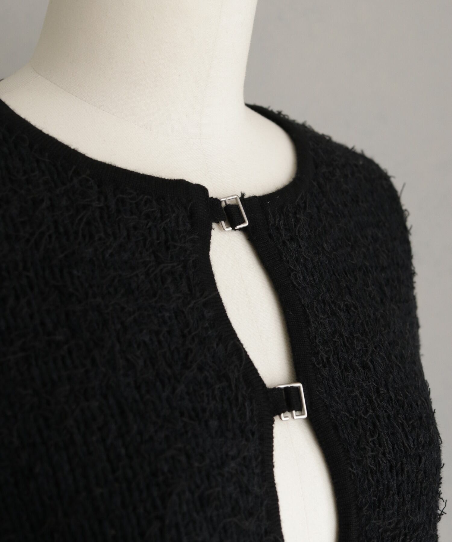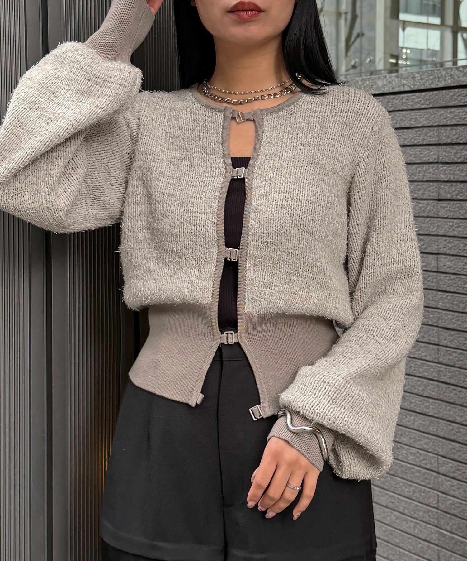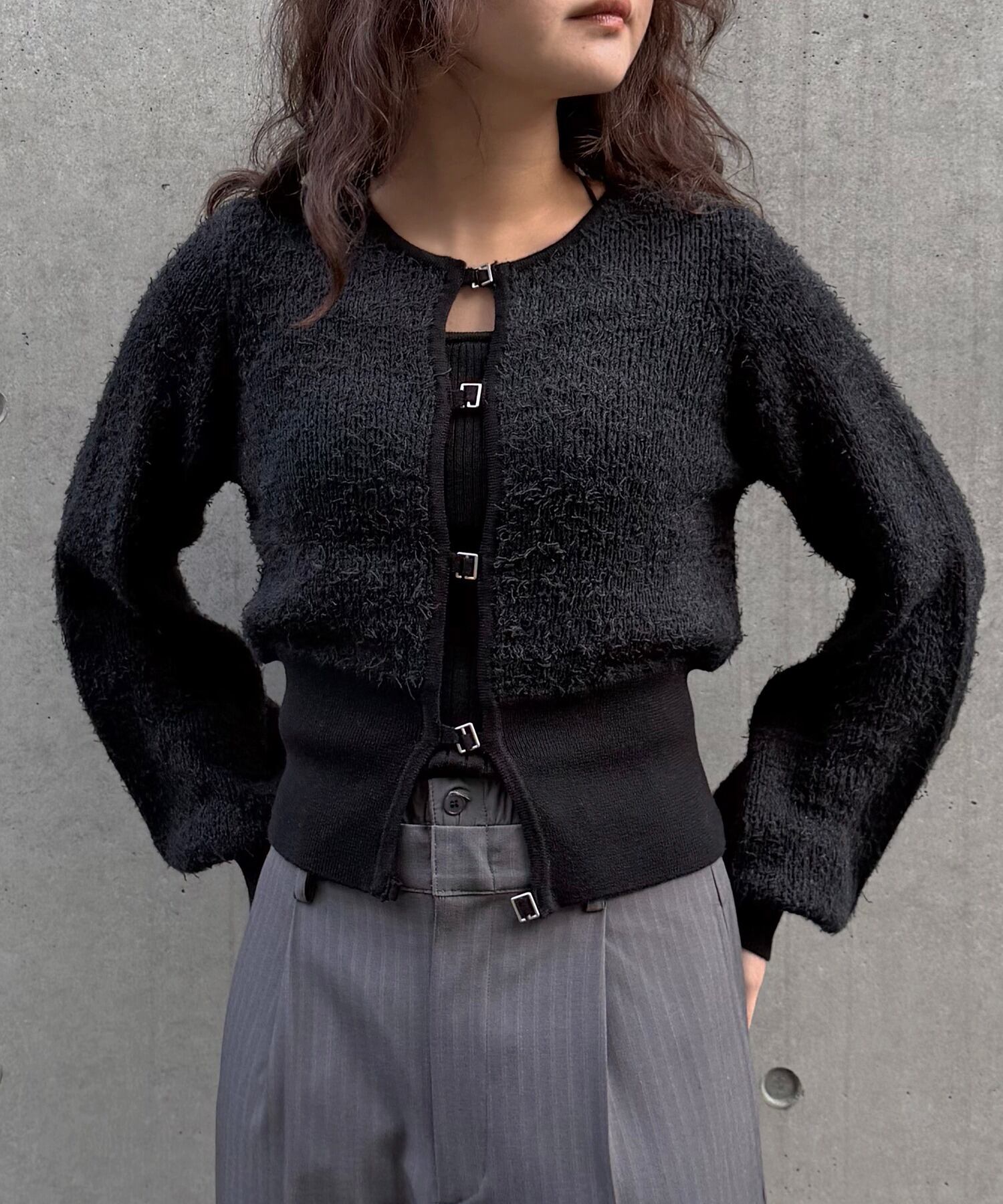 テープヤーンにフリンジや短毛フェザーをMIXし、春夏らしい軽やかさの中に表情豊かな編地を取り入れた一枚。フロントにはシルバーホックをあしらい、&g’aimeらしいモードな雰囲気を演出します。短めの着丈と、幅をもたせた裾のリブでウエストラインを自然にマークし、スタイルアップ効果も◎ボリュームのあるシルエットながら、クルーネックが首元をすっきりと見せてくれます。程よい衿ぐりやリブの長さなど、細部までこだわりの詰まった一枚。前を閉じてトップス風に、開けて羽織りとしても着られる2WAY仕様。一番下のホックを外して抜け感をプラスしたスタイリングもおすすめです。ワイドパンツやタイトスカートはもちろん、ワンピースの上からも好相性です