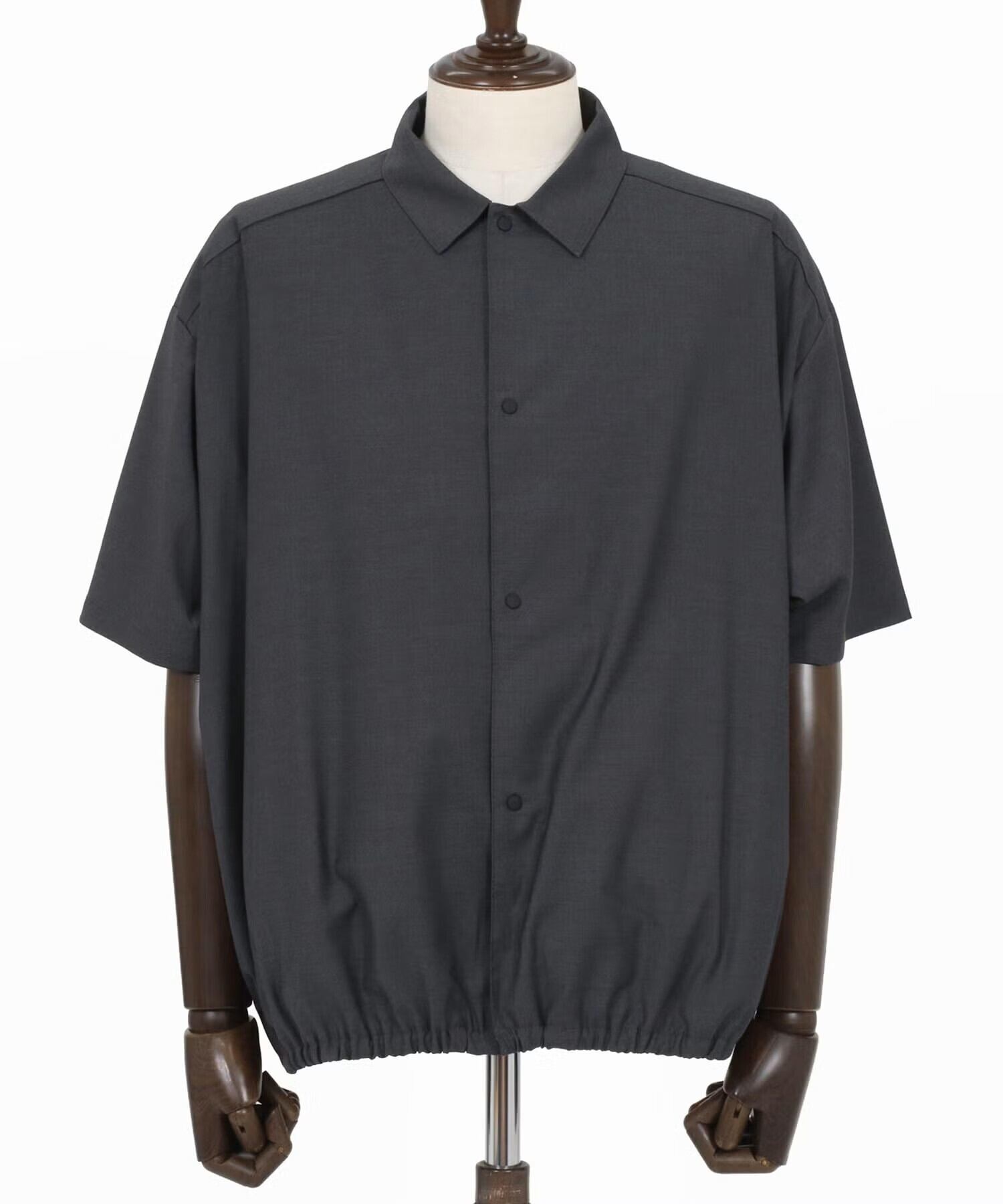 レギュラーカラーの半袖シャツをベースに、フロントにはあえてスナップボタンを採用。(マットブラックのスナップボタン。)