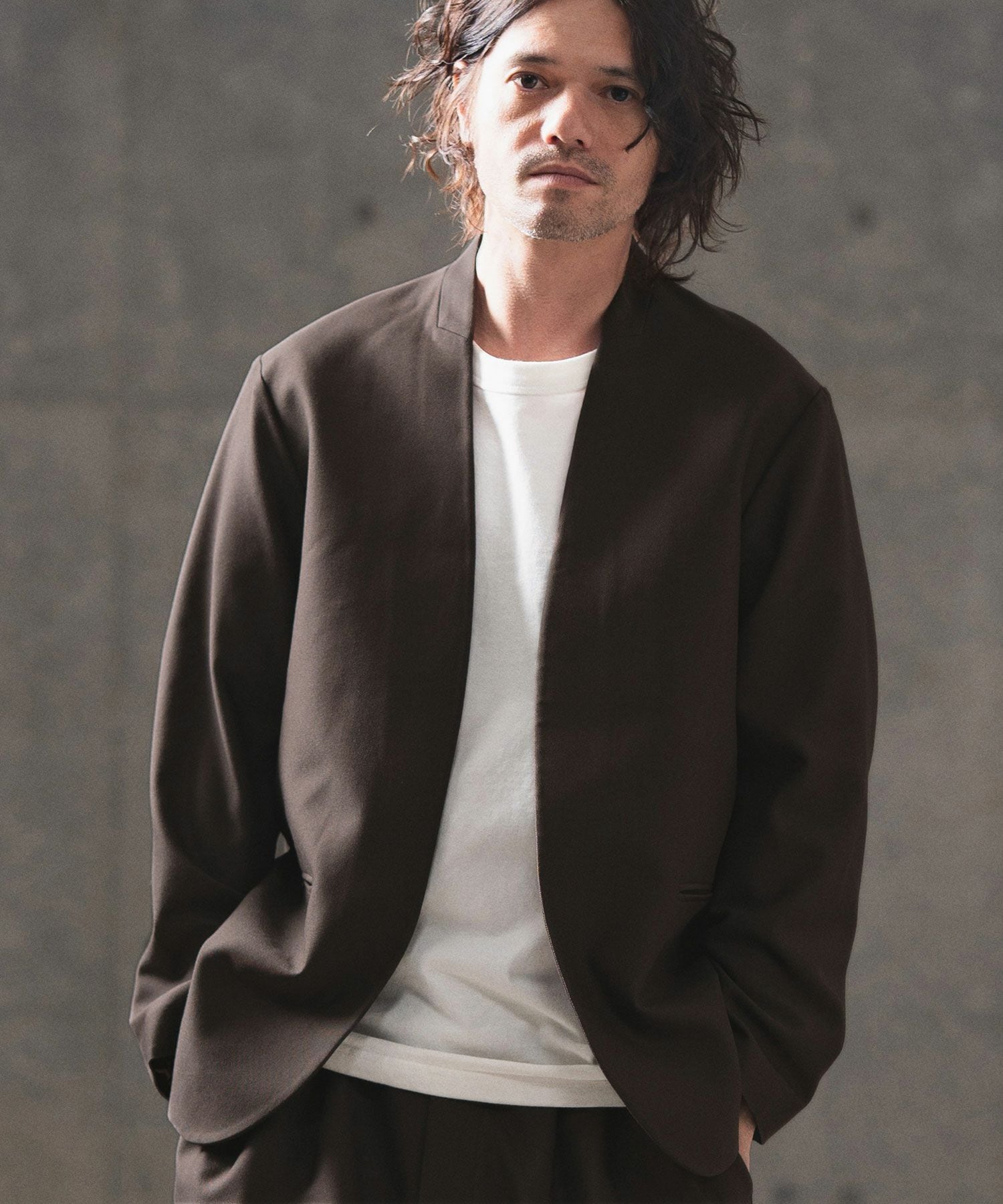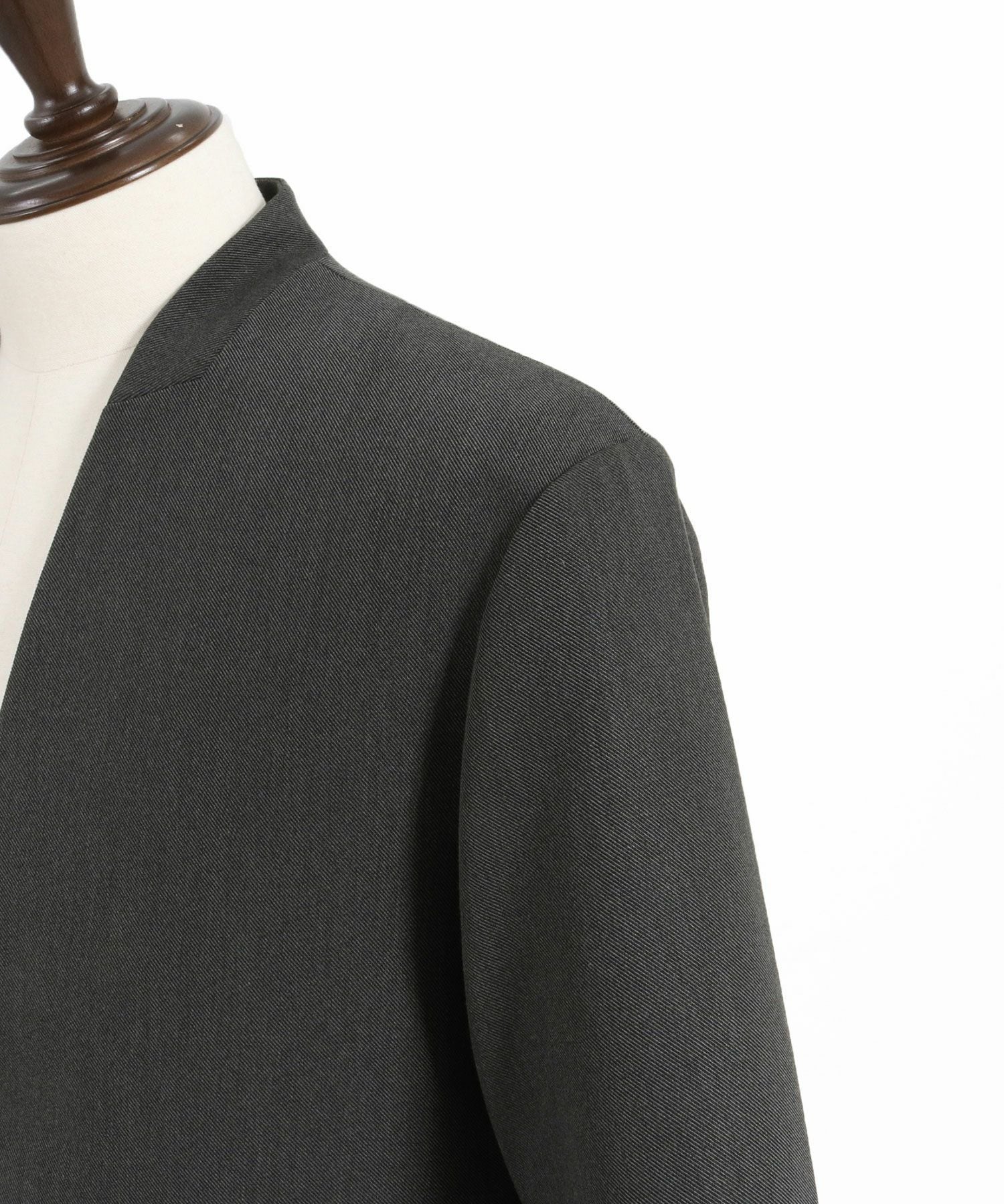 ラペルレス、ボタンレスのミニマルなフロントディテールに仕上げたジャケットです。