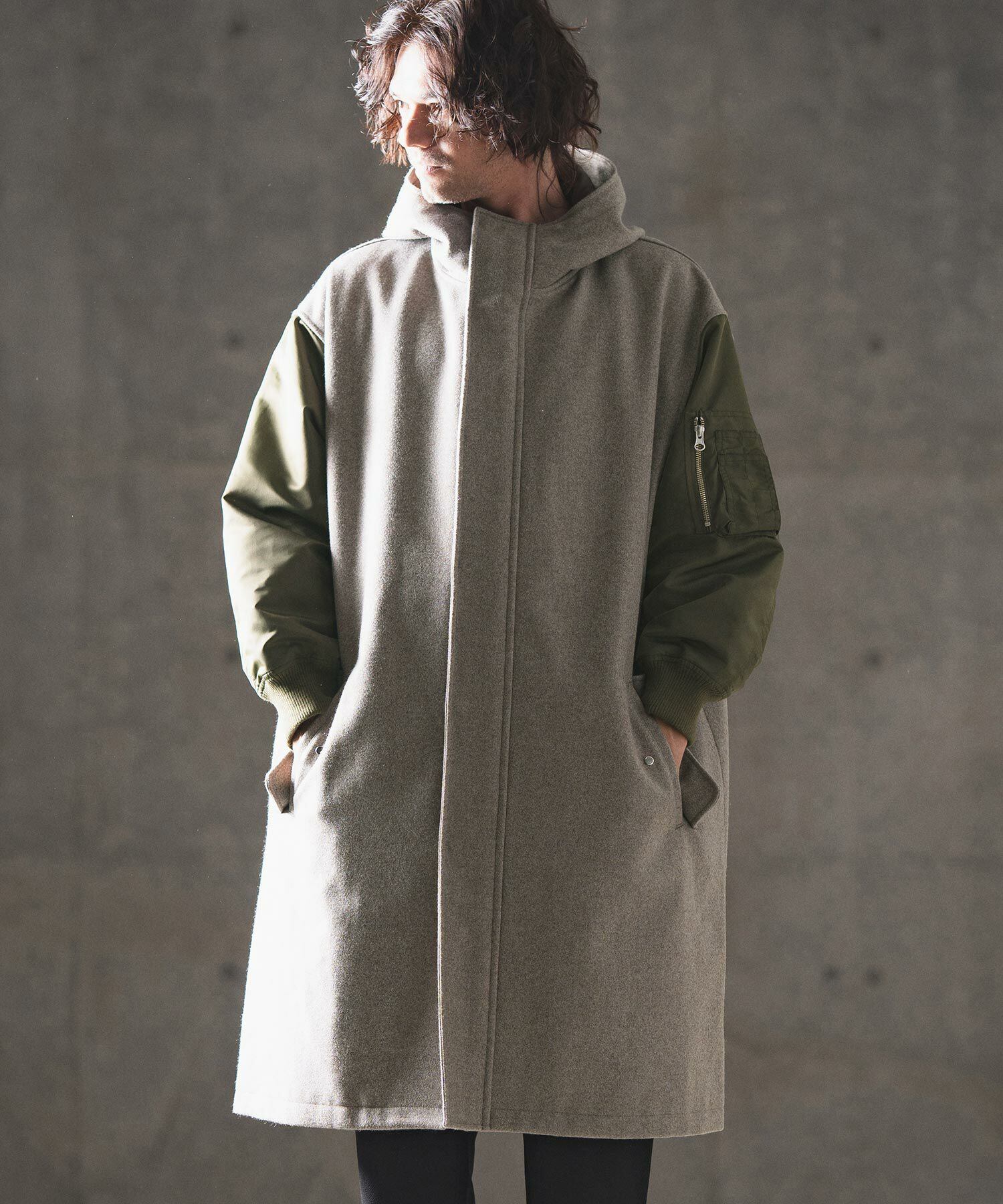 フーデッドコートをベースに、袖をMA-1フライトジャケットのデザインにした、ウィットに富んだデザイン性のアウターです。