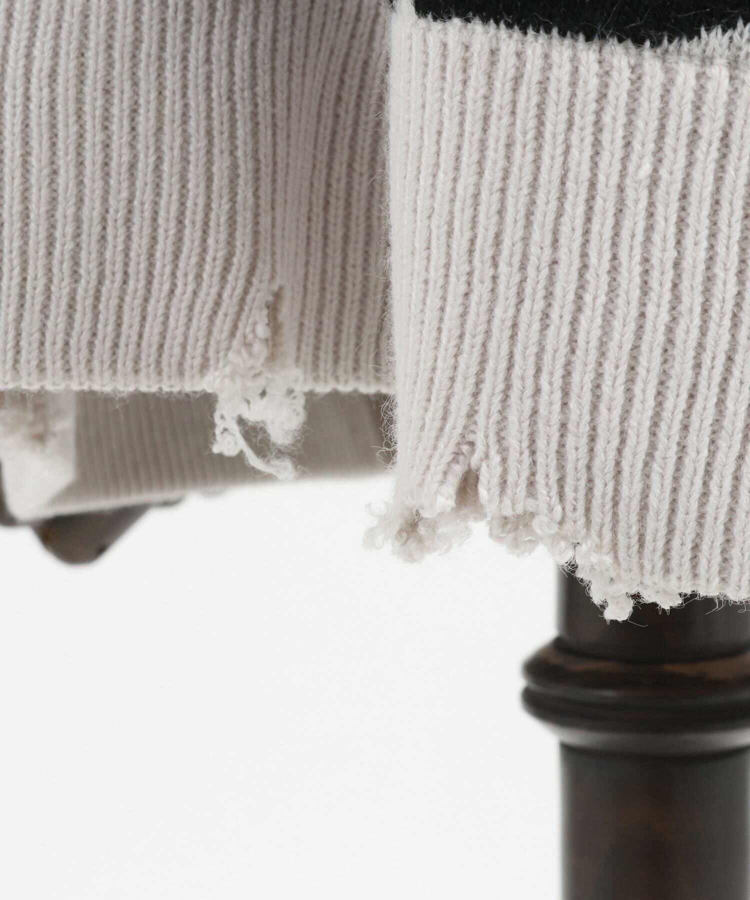 ユーズドライクな印象をミックスするために、身頃にはダメージ加工、襟・袖口・裾口にグラインダー加工を施しています。