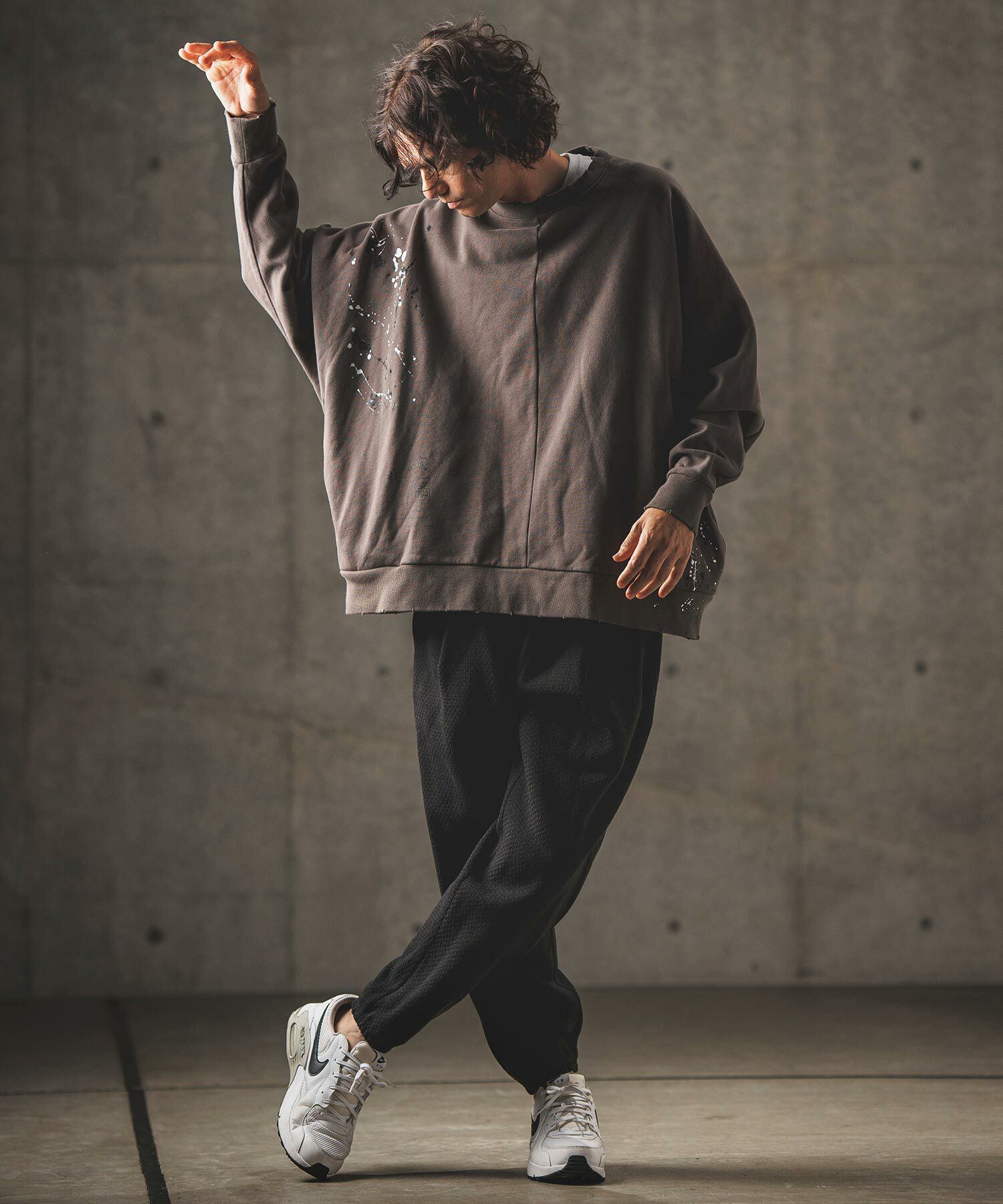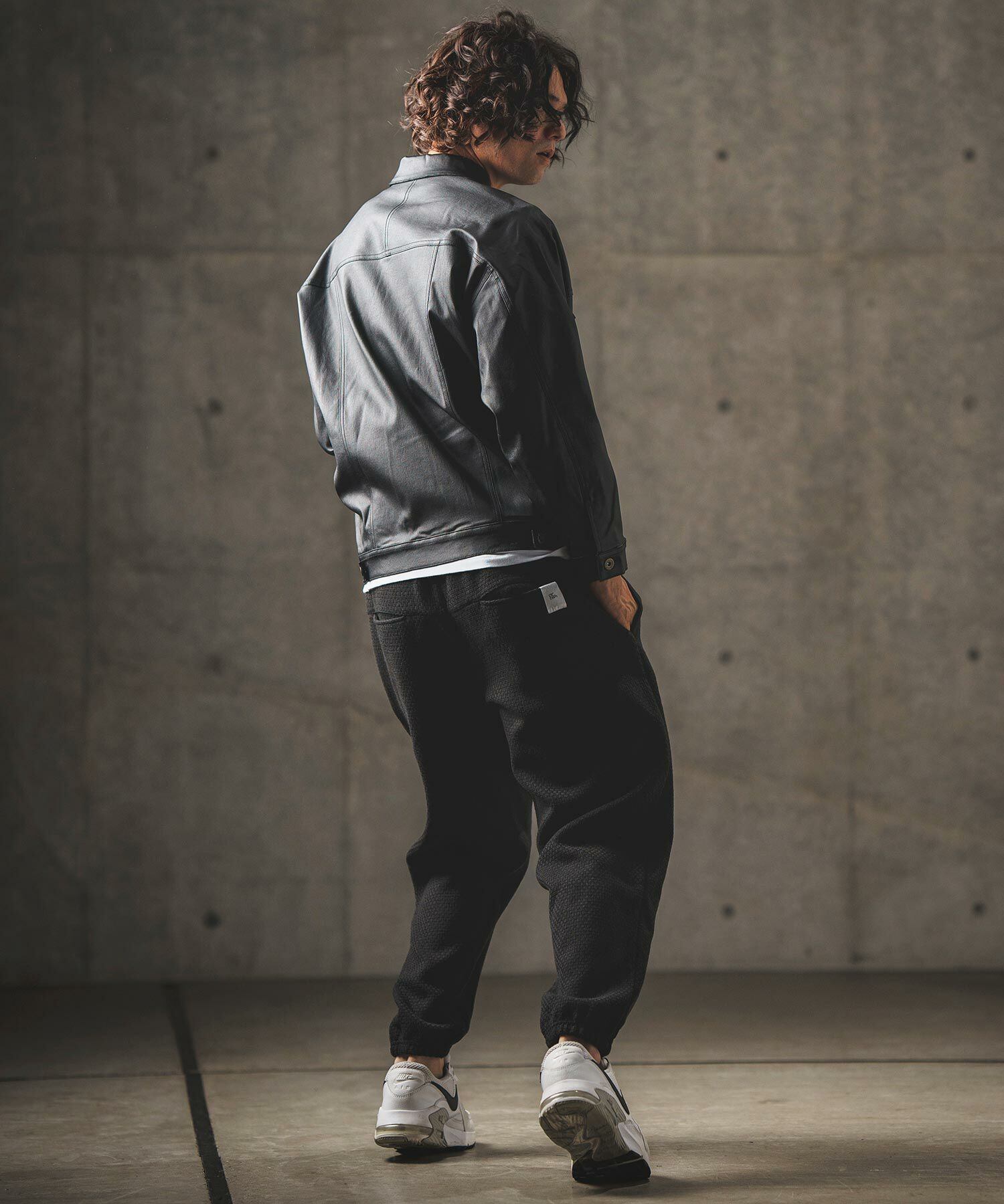 モードな雰囲気のファブリックに対して、裾口に平ゴムを配したジョガーデザインを採用してスポーツテイストをミックスしたGLIMCLAPらしいバランス感覚が特徴です。