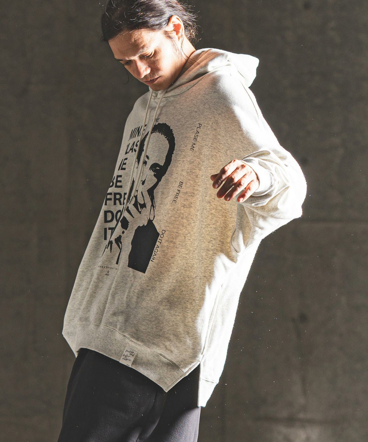 フロント身頃に大判のプリントを配したスウェットプルオーバーフーディーです。