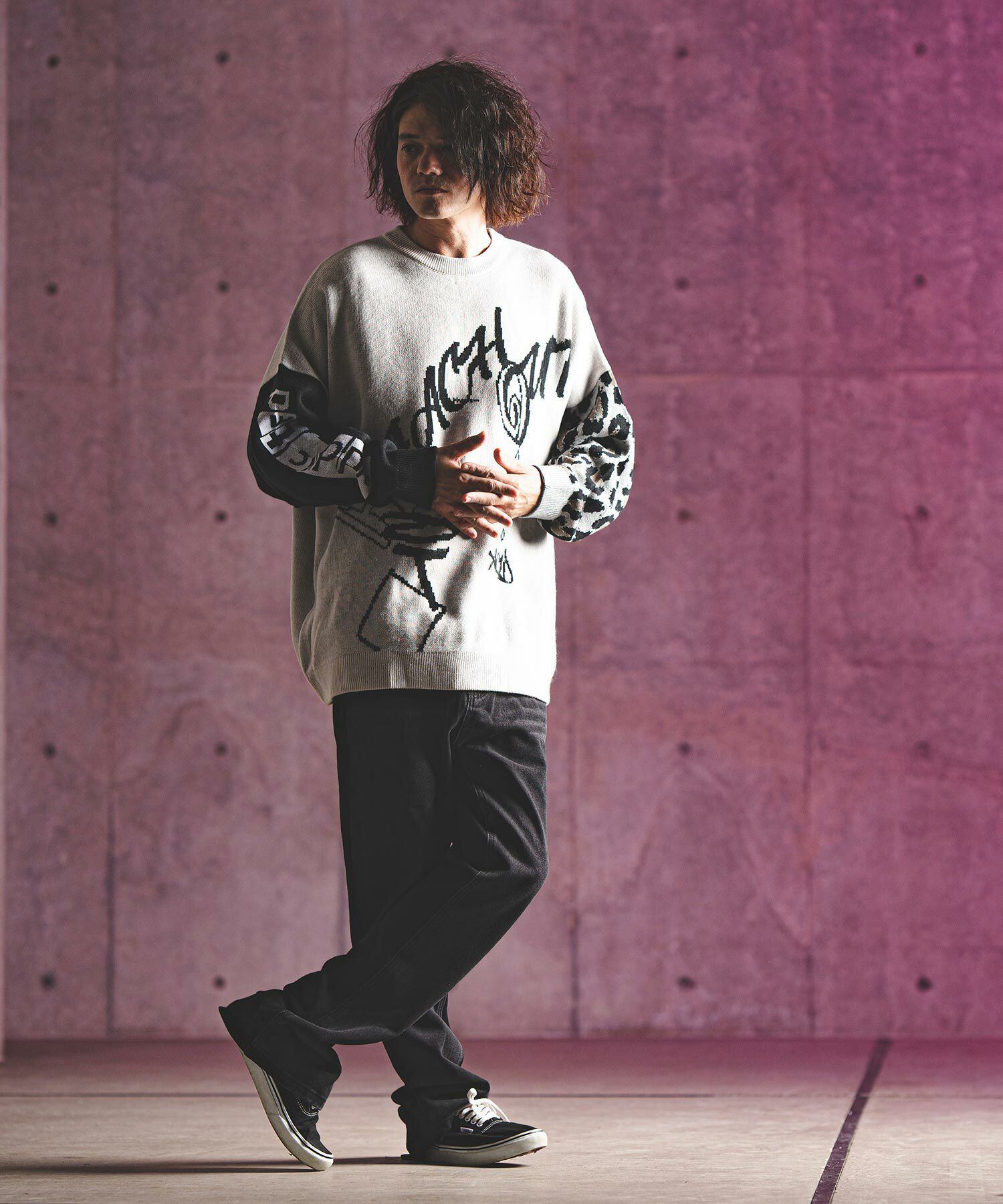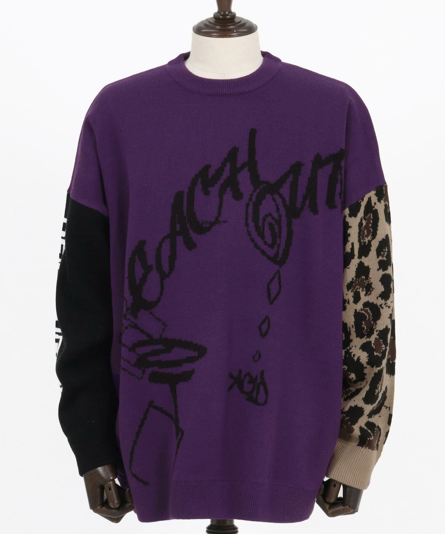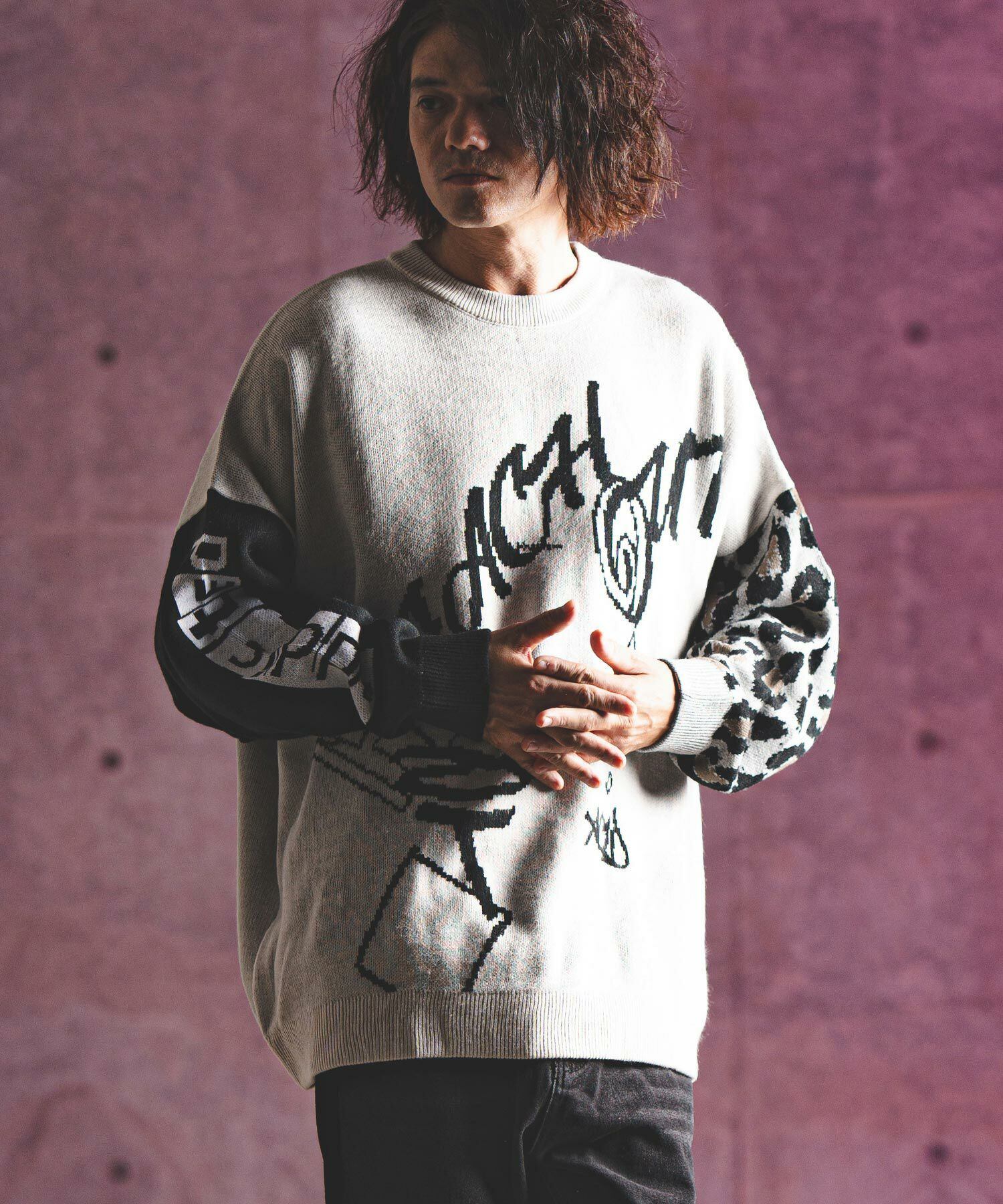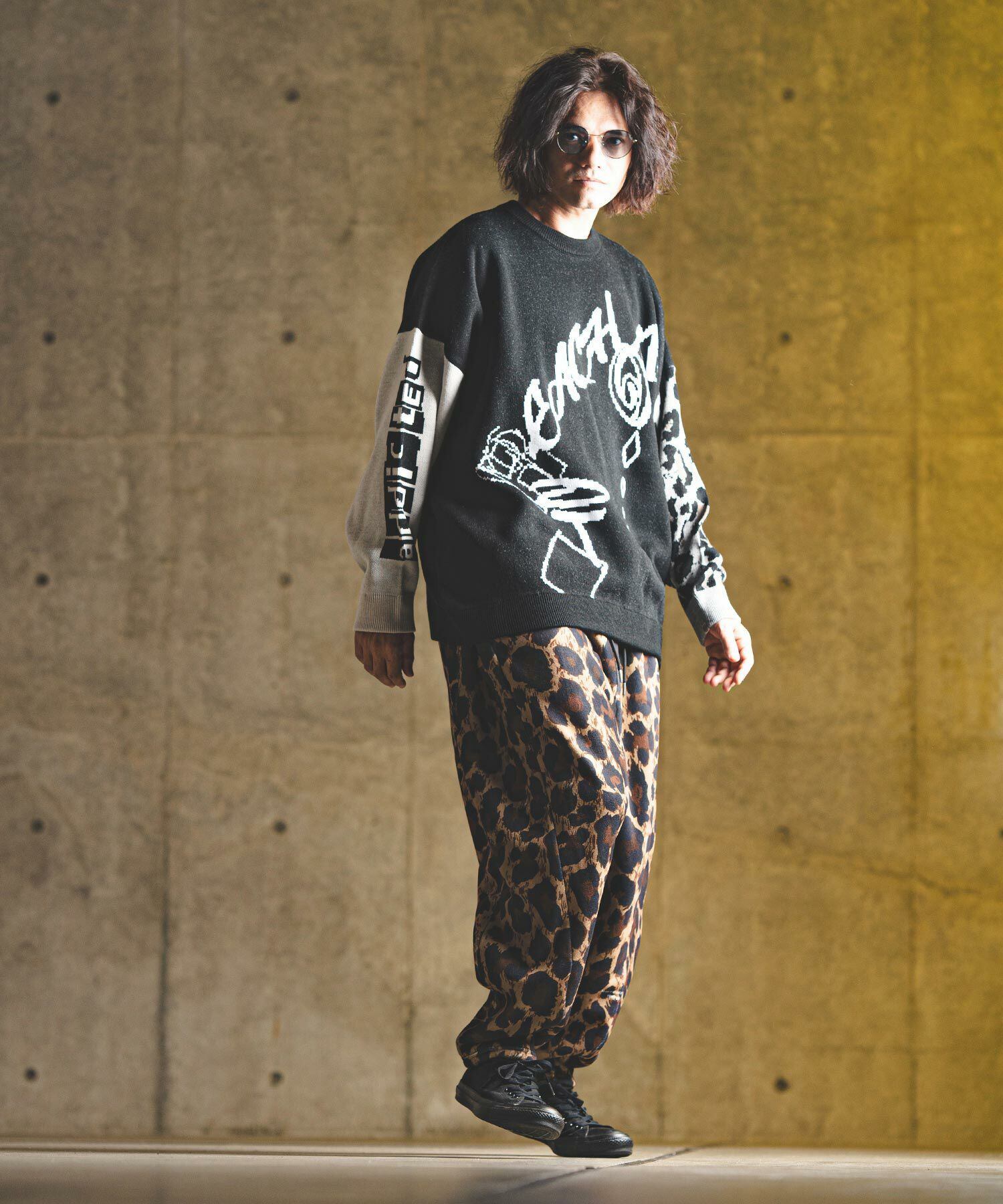 身頃と右袖にロゴのジャガード編み、左袖にレオパードパターンのジャガード編みを施したウィットに富んだデザインのニットです。