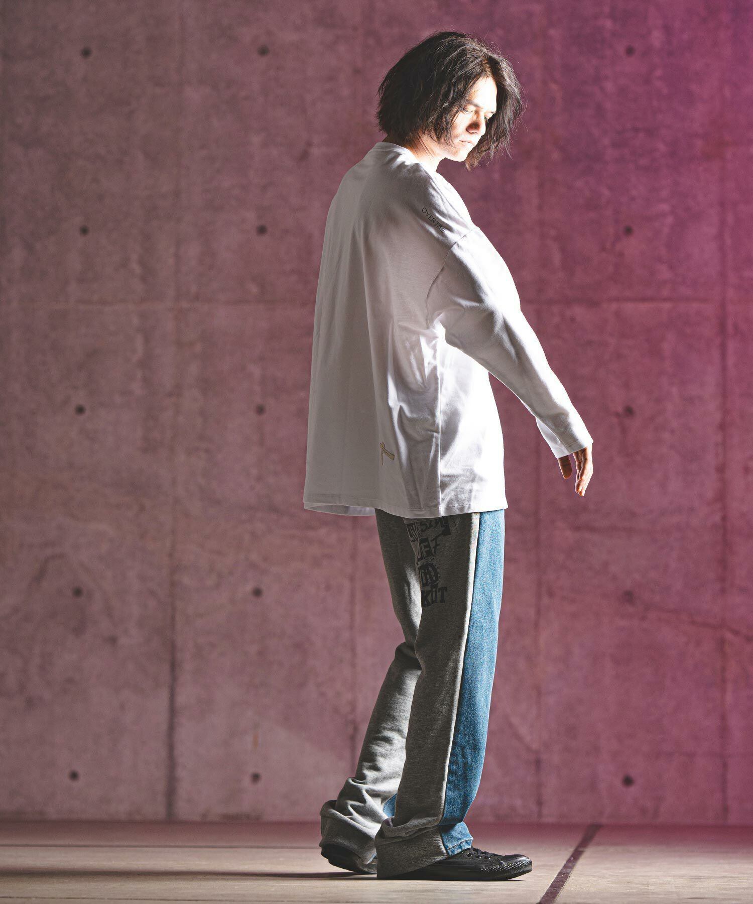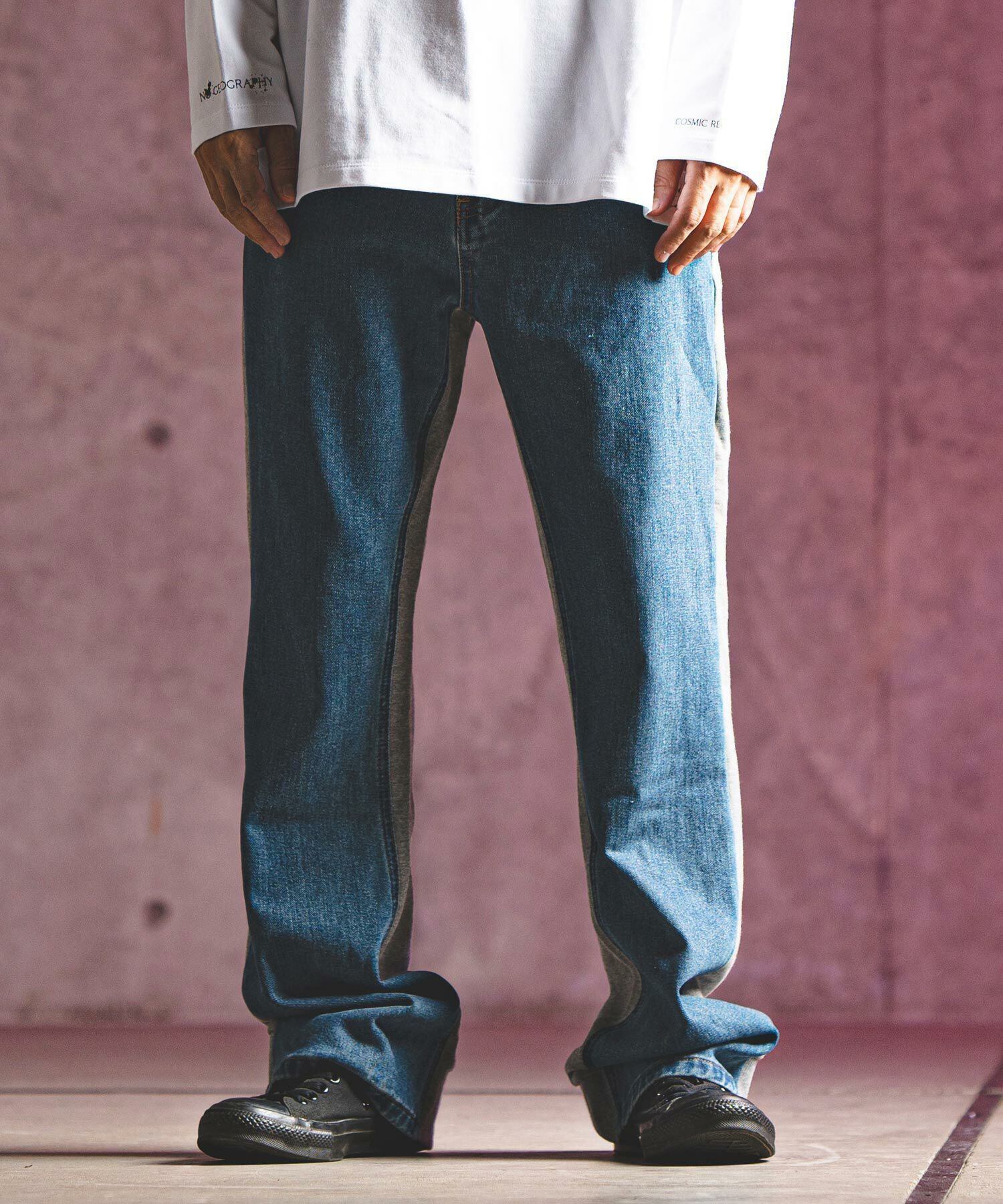フロントスタイルをデニム、バックスタイルをスウェットで切替えたパンツ。