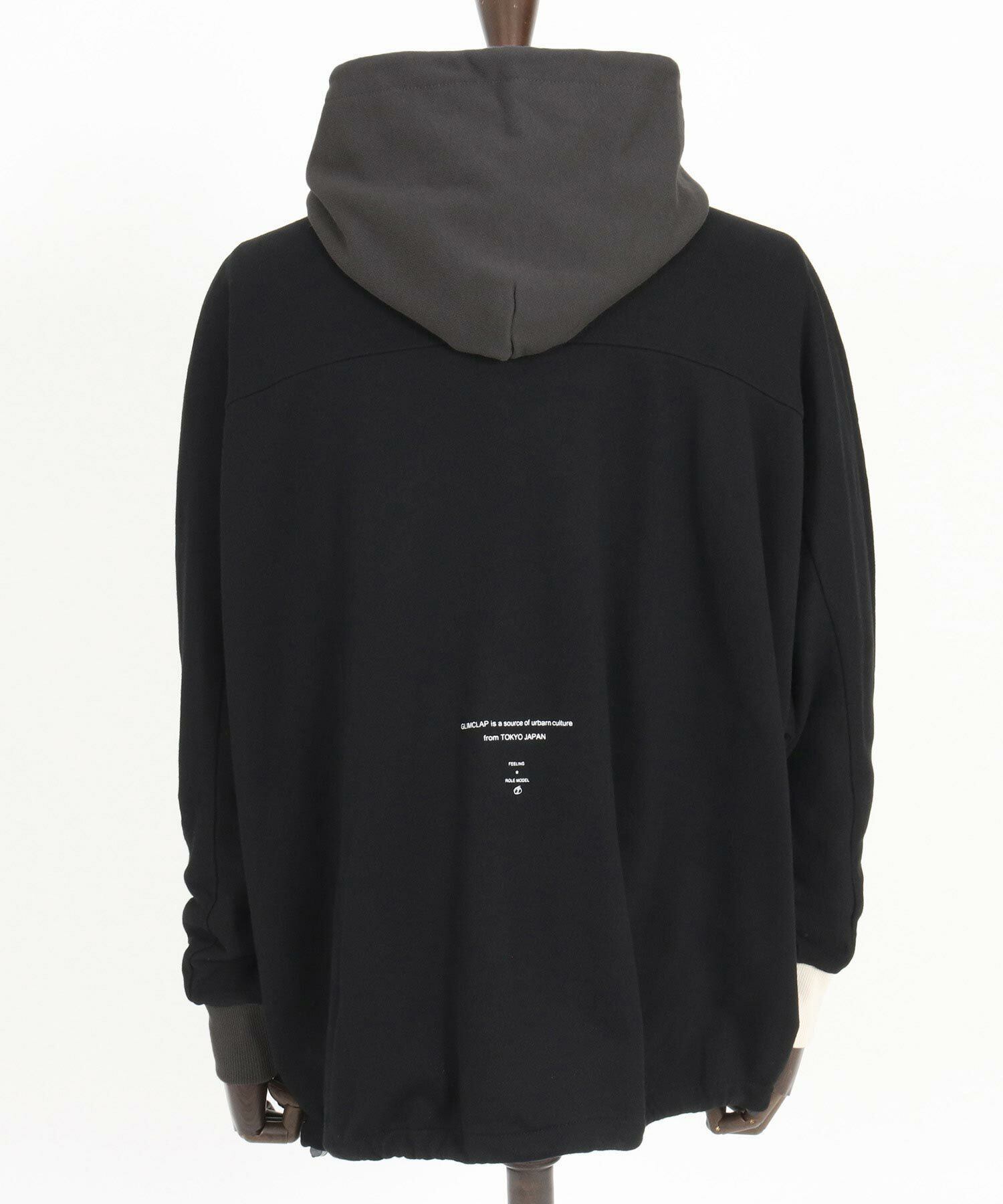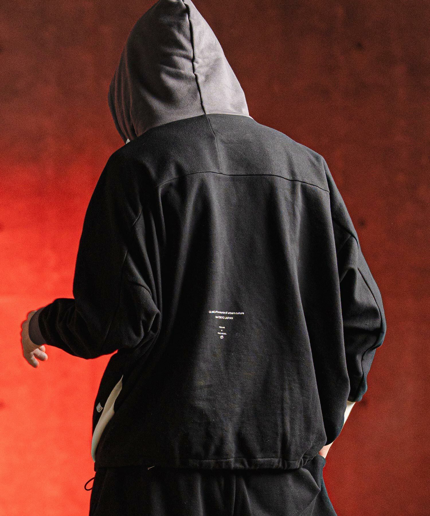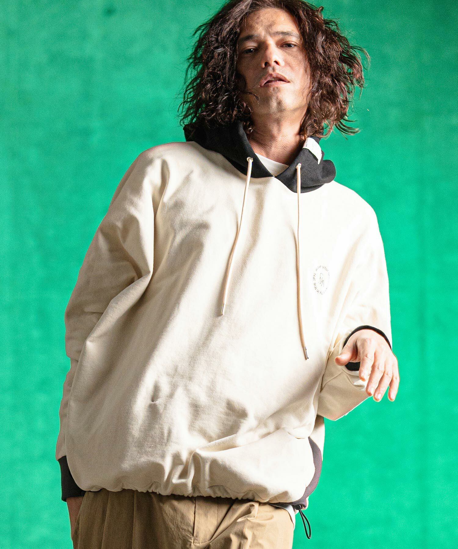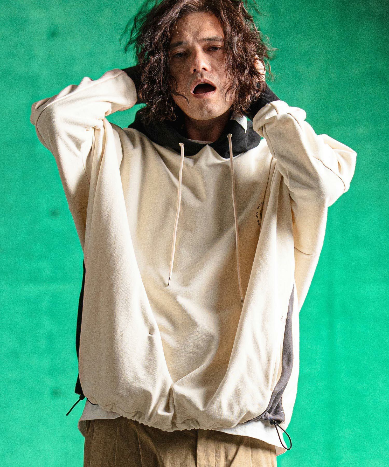 フード、袖リブ、裾脇に切替え配色を施してデザインアクセントを。