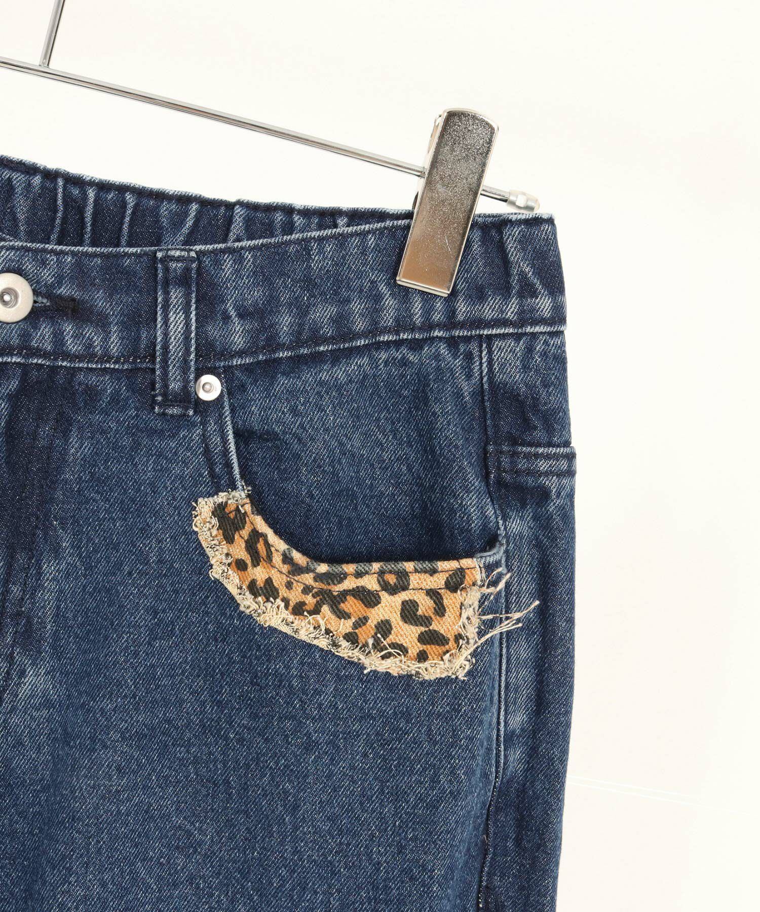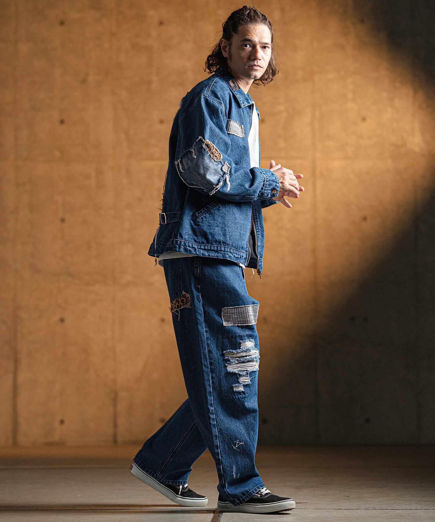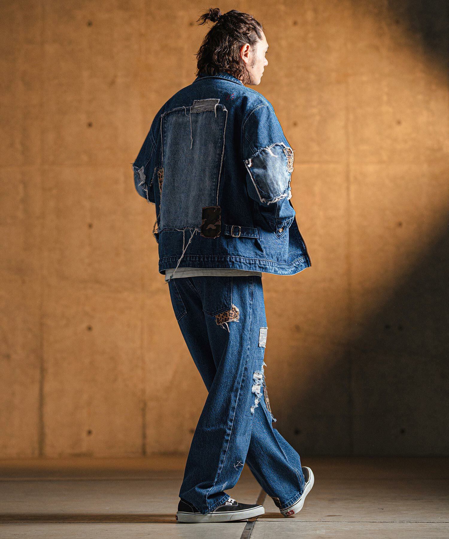 色違いのデニム、レオパード、カモフラージュ、メランジカットソーなどを用いた大胆なリペアと、手書きタッチな雰囲気の刺繍を施しリメイク要素を表現。