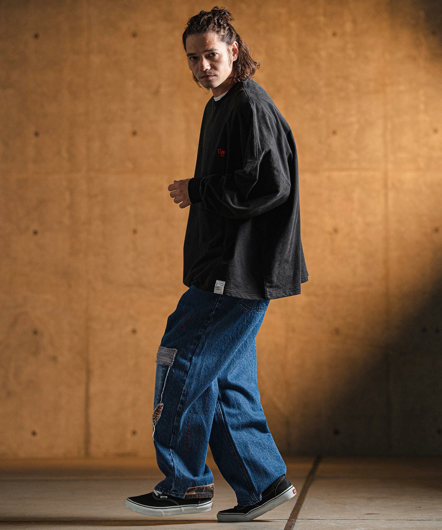 ボリュームのあるワタリやヒップ周りから真っすぐ落としたようなワイドストレートシルエット。