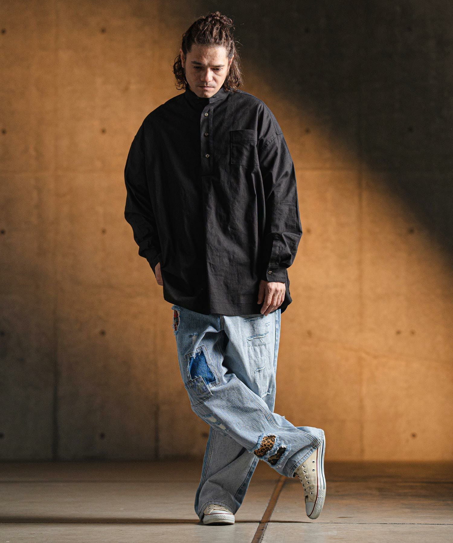チェック、レオパード、カモフラージュなどを用いたダメージ&リペア、糸残しのダメージ&リペアを施しリメイク要素を表現。