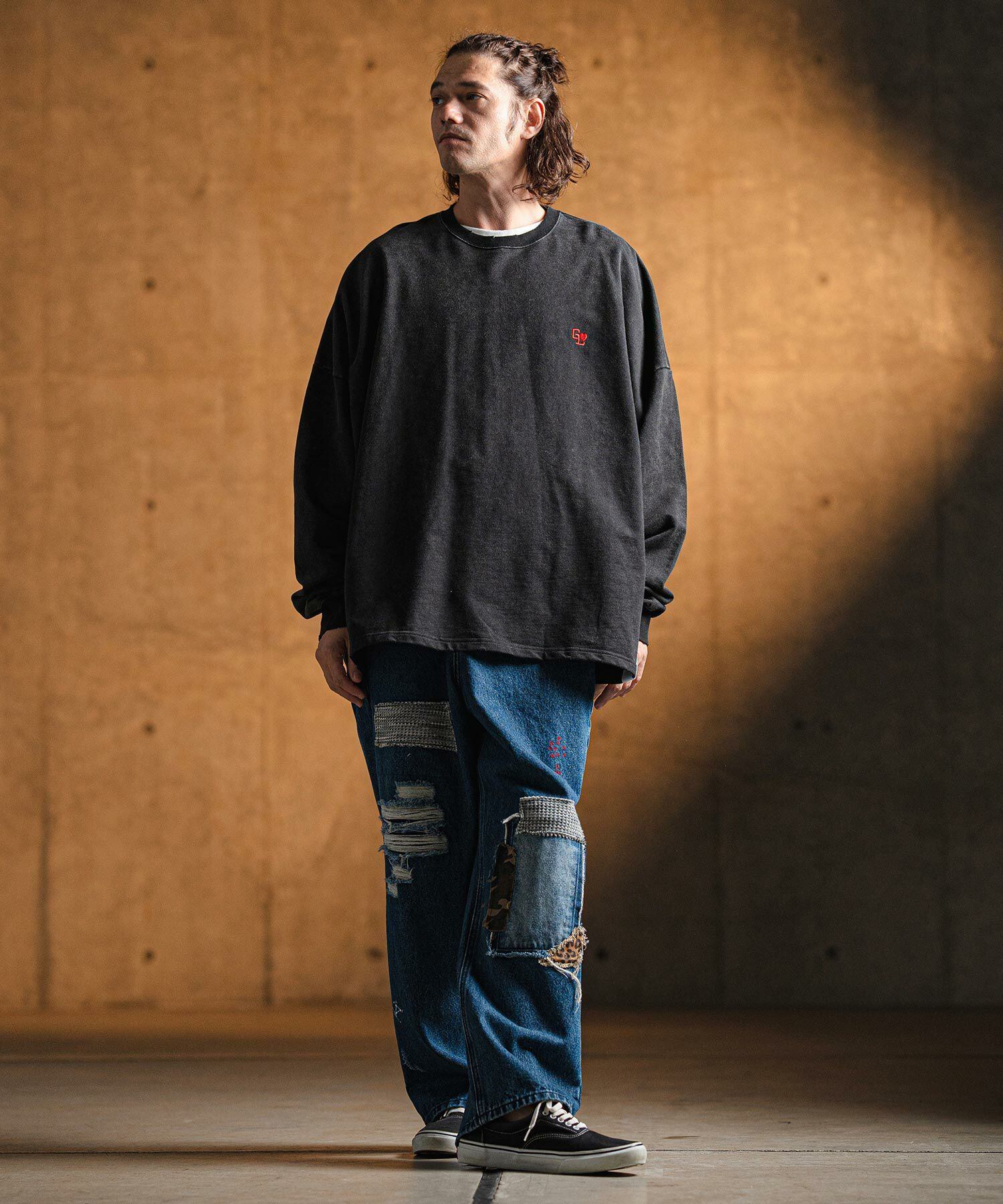 ヴィンテージ風合いの加工感をベースに、刺繍もあえてローテクな雰囲気とキャッチーなこなしを意識した仕上げです。