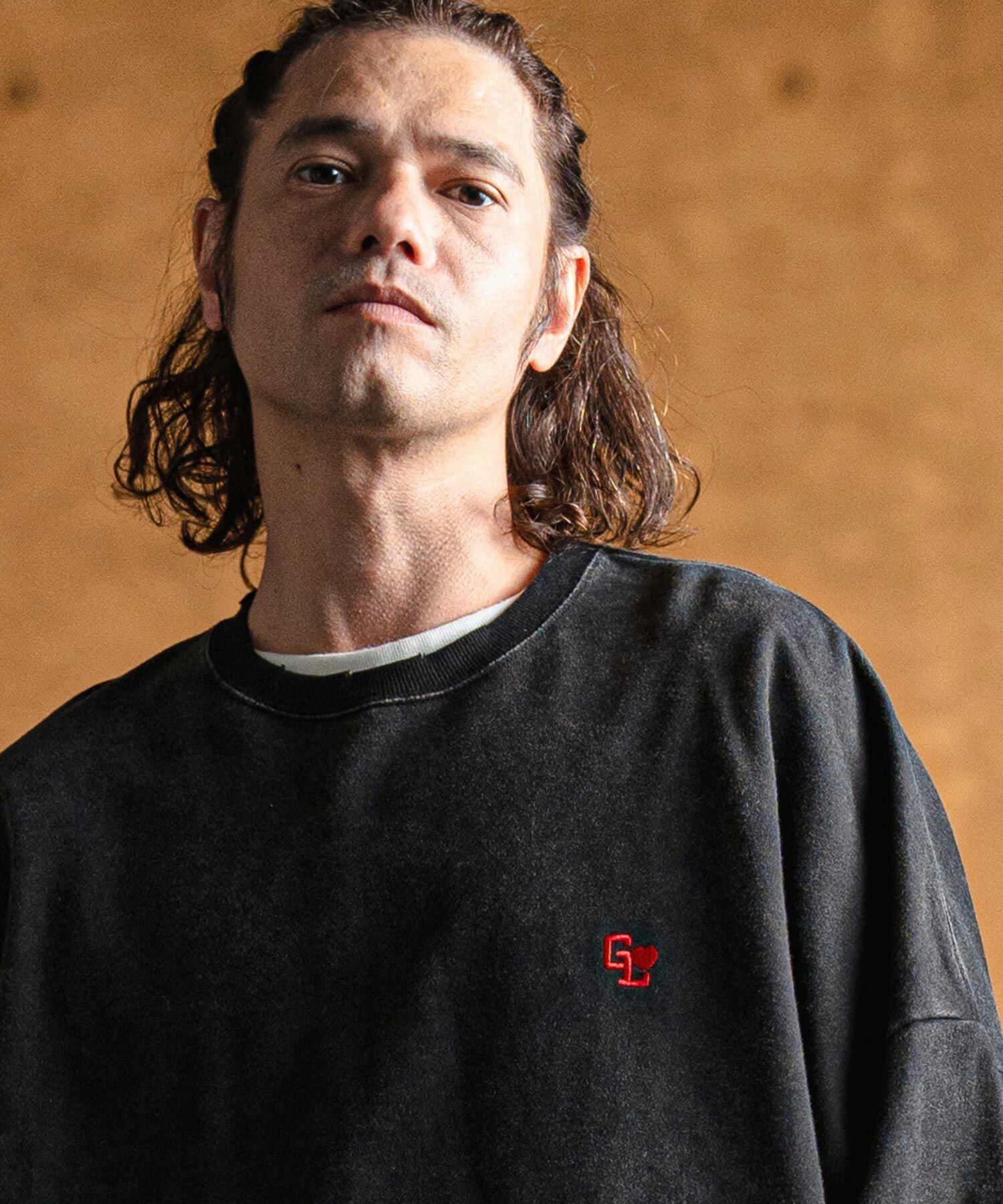 左胸にはGLIMCLAPのGL英文字とハートを組み合わせた刺繍を施してアイキャッチを注入。